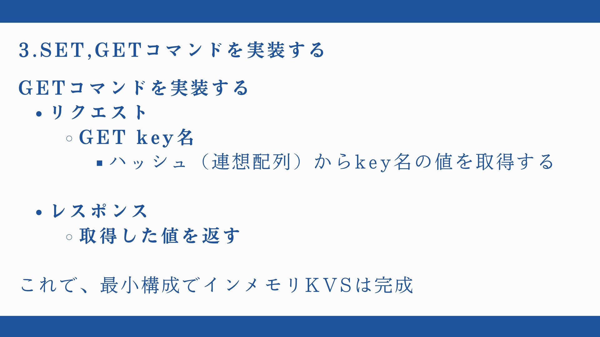 3.SET,GETコマンドを実装する GETコマンドを実装する リクエスト GET key名 ハッシュ(連想配列)からkey名の値を取得する レスポンス 取得した値を返す これで、最小構成でインメモリKVSは完成