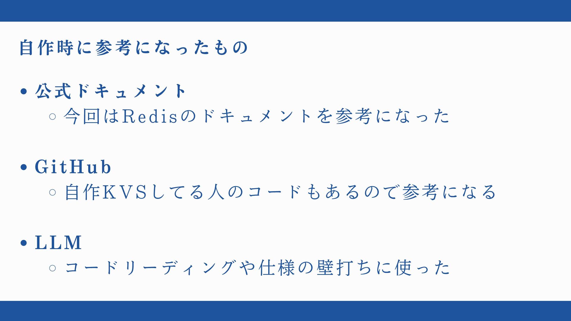 自作時に参考になったもの 公式ドキュメント 今回はRedisのドキュメントを参考になった GitHub 自作KVSしてる人のコードもあるので参考になる LLM コードリーディングや仕様の壁打ちに使った