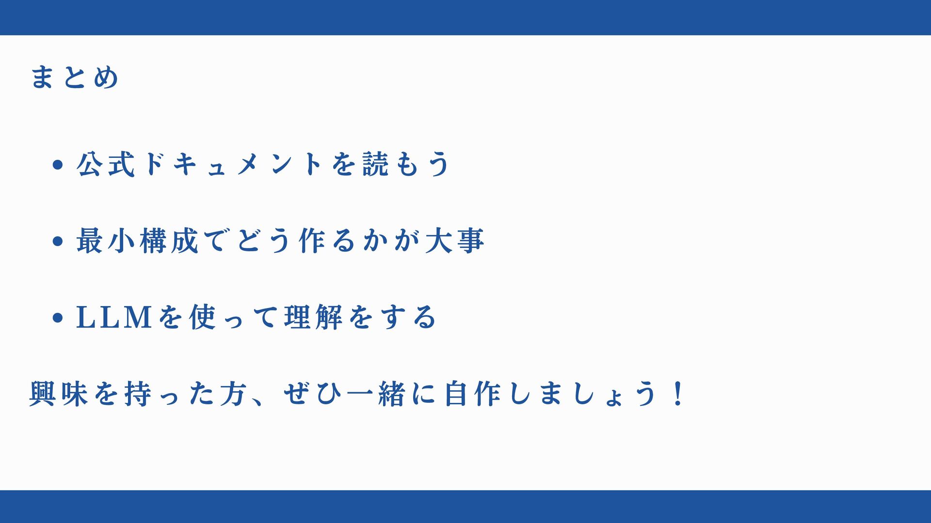 まとめ 公式ドキュメントを読もう 最小構成でどう作るかが大事 LLMを使って理解をする 興味を持った方、ぜひ一緒に自作しましょう!
