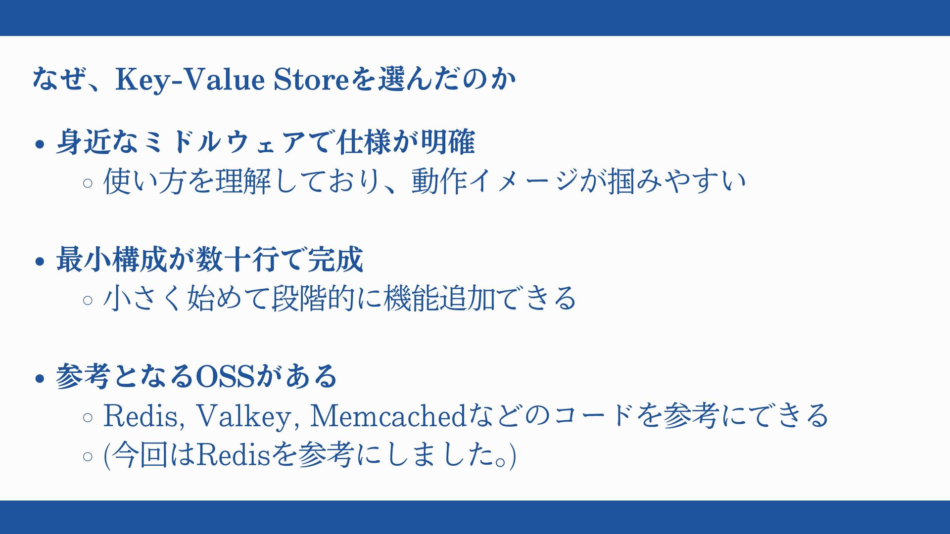 なぜ、Key-Value Storeを選んだのか 身近なミドルウェアで仕様が明確 使い方を理解しており、動作イメージが掴みやすい 最小構成が数十行で完成 小さく始めて段階的に機能追加できる 参考となるOSSがある Redis, Valkey, Memcachedなどのコードを参考にできる