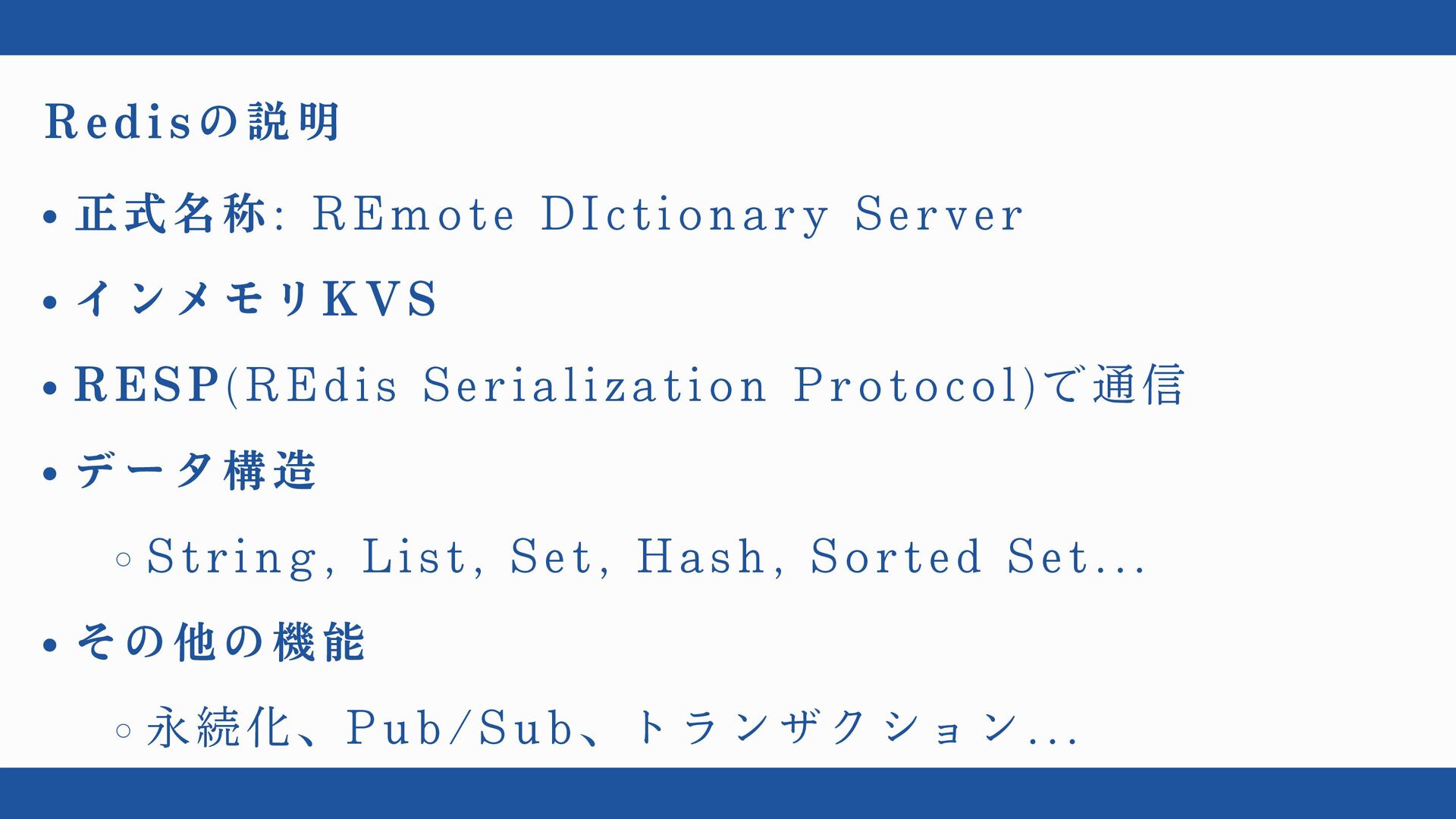 Serialization Protocol)で通信 データ構造 String, List, Set, Hash, Sorted Set... その他の機能 永続化、 Pub/Sub、 トランザクション...