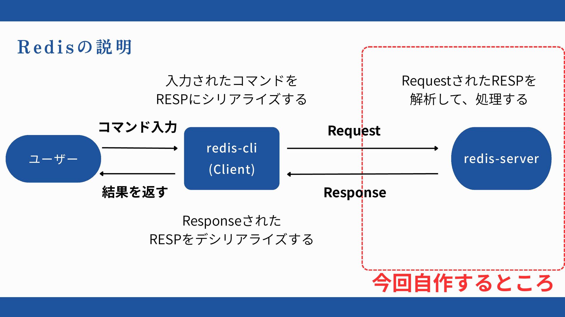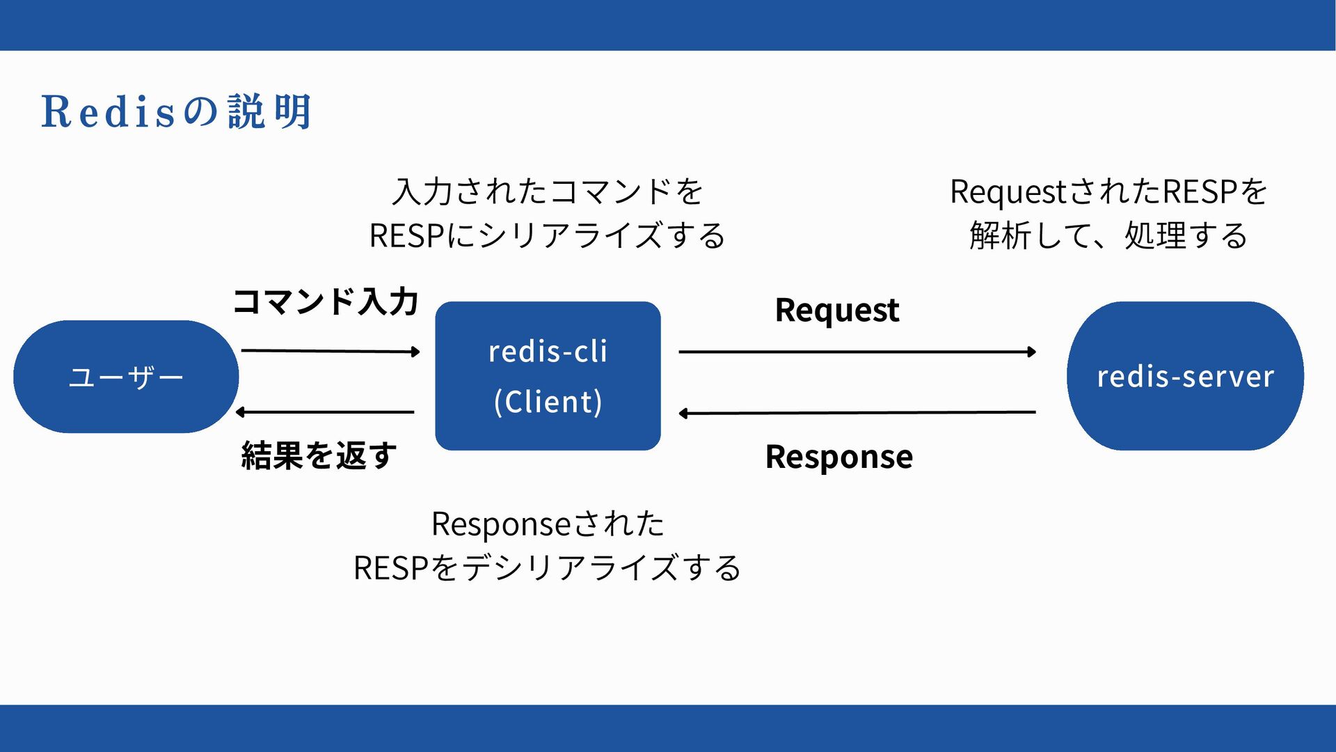 redis-cli (Client) redis-server ユーザー Redis の説明 コマンド入力 入力されたコマンドを RESPにシリアライズする Responseされた