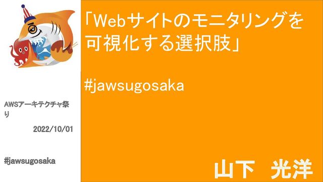 「Webサイトのモニタリングを 可視化する選択肢」 #jawsugosaka AWSアーキテクチャ祭 り 2022/10/01 #jawsugosaka 山下 光洋