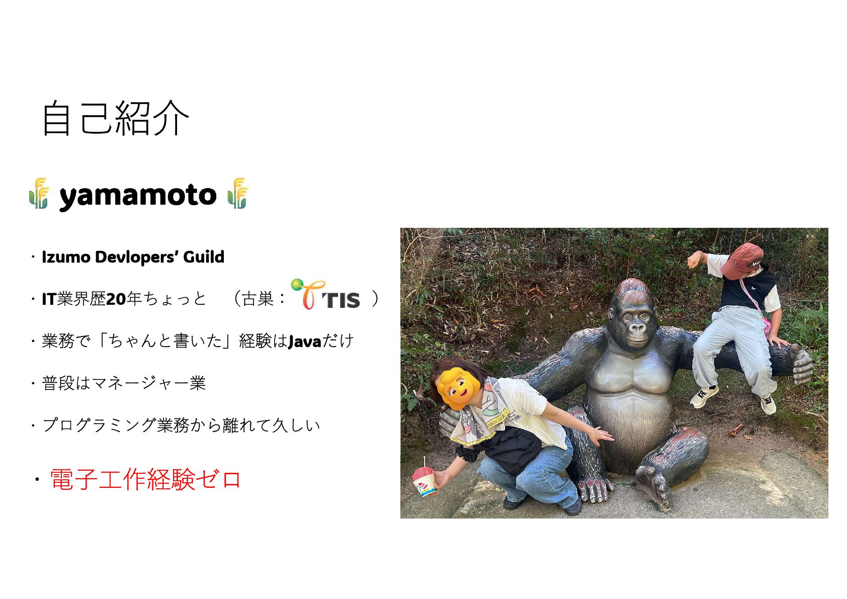 自己紹介 yamamoto ・Izumo Devlopers’ Guild ・IT業界歴20年ちょっと (古巣: ) ・業務で「ちゃんと書いた」経験はJavaだけ ・普段はマネージャー業