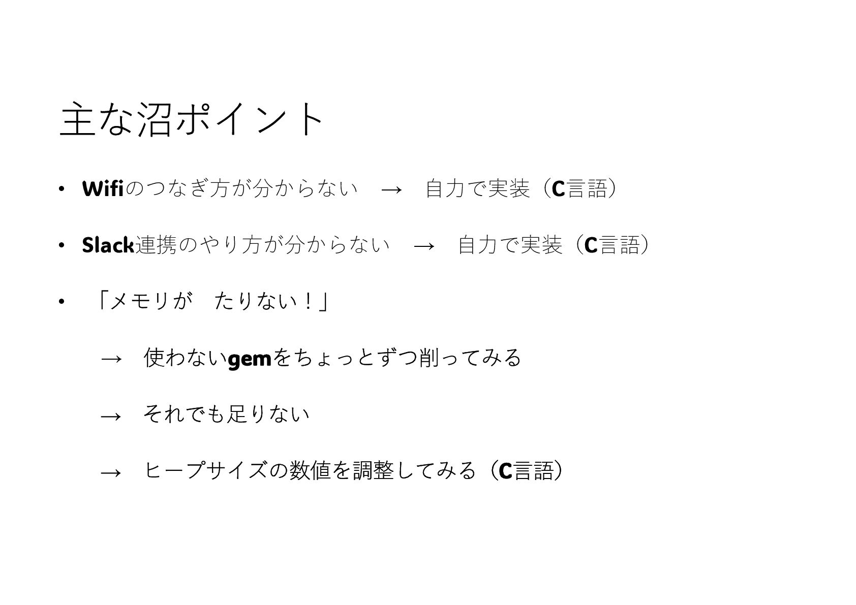 主な沼ポイント • Wifiのつなぎ方が分からない → 自力で実装(C言語) • Slack連携のやり方が分からない → 自力で実装(C言語) •