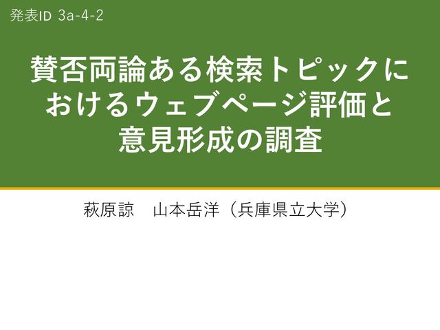 ウェブページ どのようなウェブページが参考になるのか • 閲覧したウェブページの中で参考になった理由にラベル付け • ラベルは先行研究をもとに作成 • 複数のラベルが付与できる場合には複数のラベルを付与 Y. Sun, Y. Zhang, J. Gwizdka, and C. B. Trace. Consumer evaluation of the quality of online health information: Systematic literature review of relevant criteria and indicators. Journal of Medical Internet Research, 21(5):e12522, 2019. 浜島聡一郎, 山本岳洋, 山本祐輔, 大島裕明. 健康情報検索における信憑性判断と意見の形成に関する調査. 第 14 回データ工学と情報マネジメントに関 するフォーラム, A34–5, 2022.