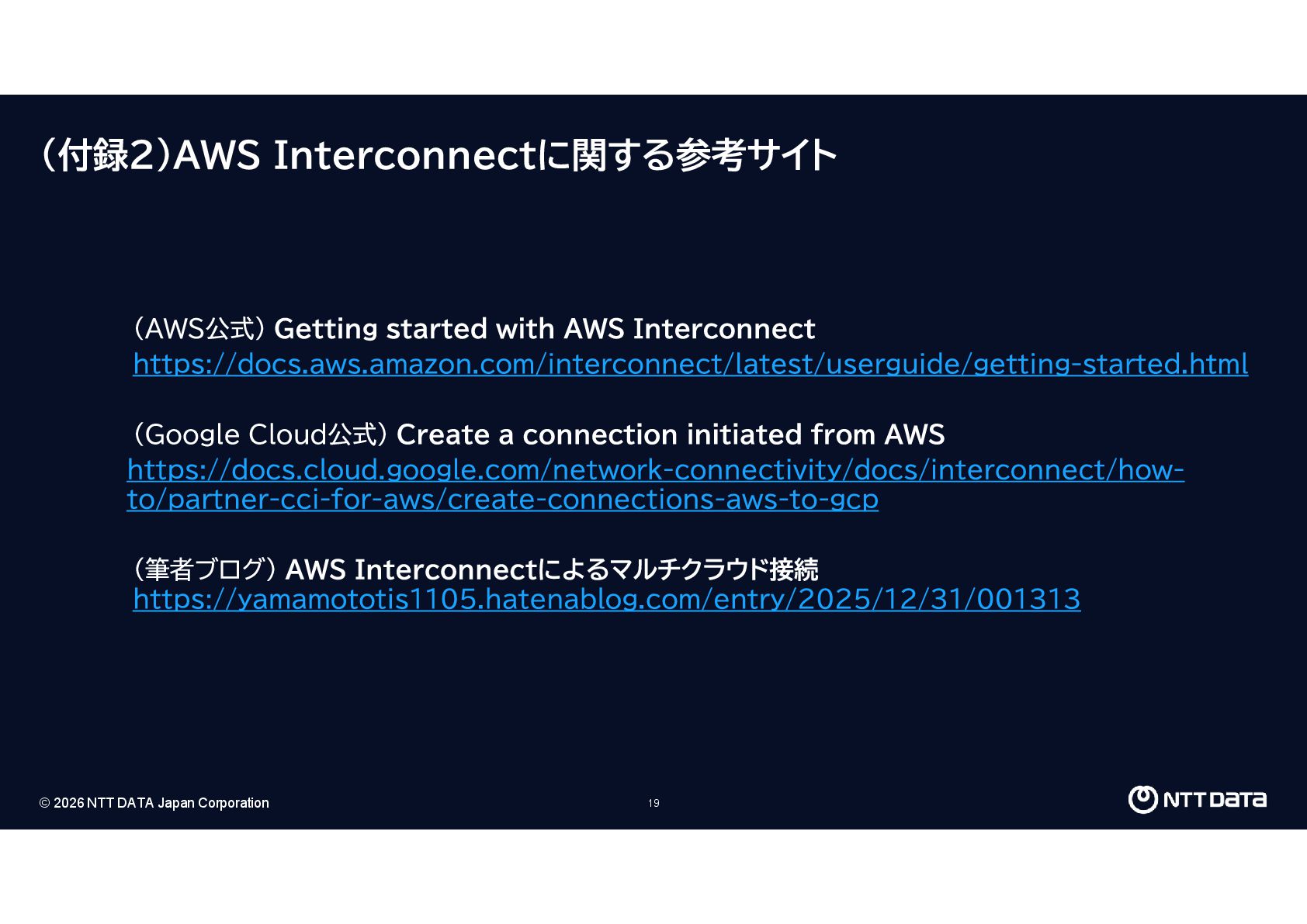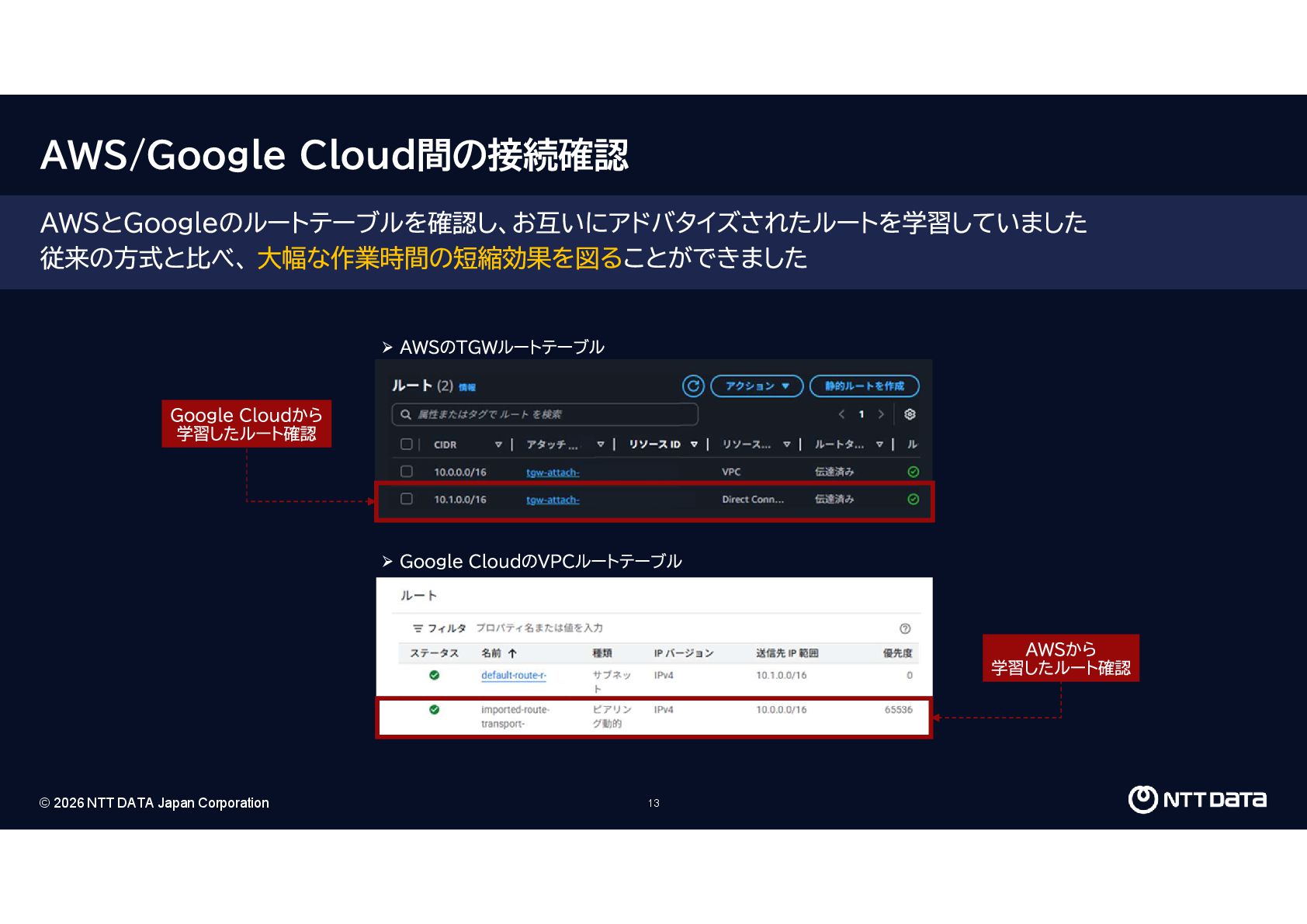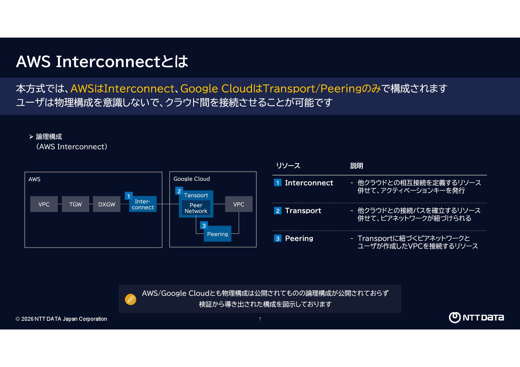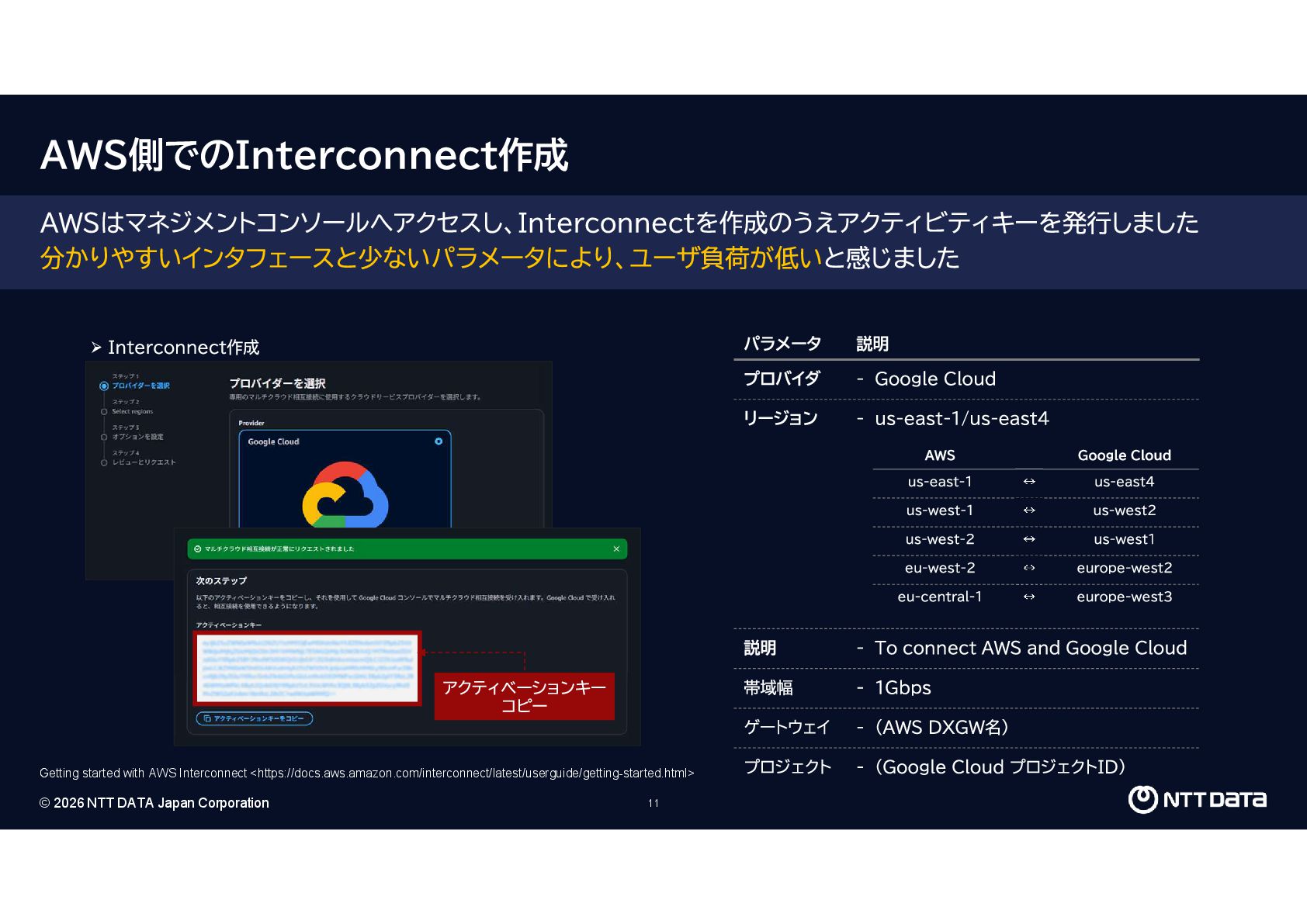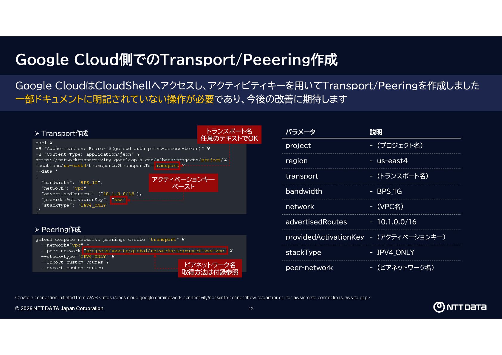 initiated from AWS <https://docs.cloud.google.com/network-connectivity/docs/interconnect/how-to/partner-cci-for-aws/create-connections-aws-to-gcp> curl ¥ -H "Authorization: Bearer $(gcloud auth print-access-token)" ¥ -H "Content-Type: application/json" ¥ https://networkconnectivity.googleapis.com/v1beta/projects/project/¥ locations/us-east4/transports?transportId=transport ¥ --data ' { "bandwidth": "BPS_1G", "network": "vpc", "advertisedRoutes": ["10.1.0.0/16"], "providerActivationKey": "xxx", "stackType": "IPV4_ONLY" }' gcloud compute networks peerings create "transport" ¥ --network="vpc" ¥ --peer-network="projects/xxx-tp/global/networks/transport-xxx-vpc" ¥ --stack-type="IPV4_ONLY" ¥ --import-custom-routes ¥ --export-custom-routes