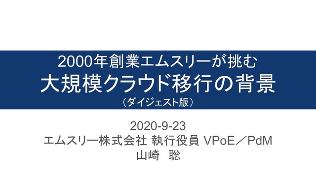 そのエムスリーでは、インフラのクラウド移行作業の真っ最中で、特に昨年末より多くのプロダクト、コンポーネントがクラウド環境に移行しています。 そこで得られた、大きなトラブルなく移行するための技術的、経営的知見を共有します。