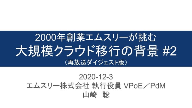 そのエムスリーでは、インフラのクラウド移行作業の真っ最中で、特に昨年末より多くのプロダクト、コンポーネントがクラウド環境に移行しています。 そこで得られた、大きなトラブルなく移行するための技術的、経営的知見を共有します。
