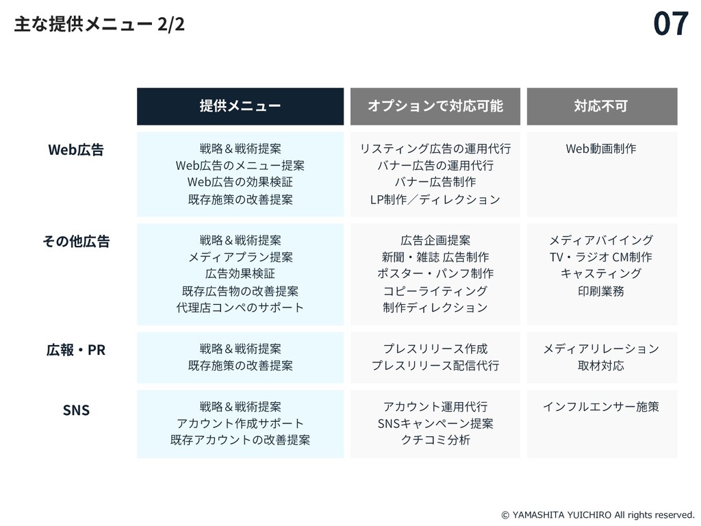 © YAMASHITA YUICHIRO All rights reserved. サービス概要 貴社の社外パートナーとして 戦略・戦術の設計から効果検証まで Webマーケティングを全⾯サポート