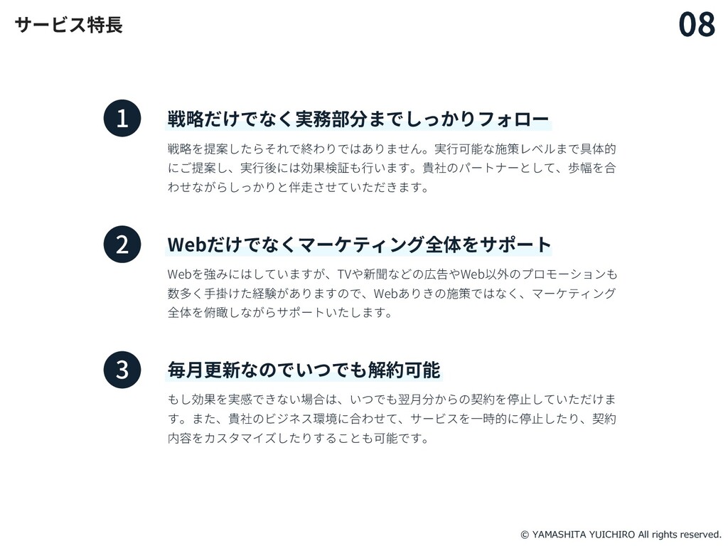 Webだけでなくマーケティング全体をサポート Webを強みにはしていますが、TVや新聞などの広告やWeb以外のプロモーションも 数多く⼿掛けた経験がありますので、Webありきの施策ではなく、マーケティング 全体を俯瞰しながらサポートいたします。 毎⽉更新なのでいつでも解約可能 もし効果を実感できない場合は、いつでも翌⽉分からの契約を停⽌していただけま す。また、貴社のビジネス環境に合わせて、サービスを⼀時的に停⽌したり、契約 内容をカスタマイズしたりすることも可能です。 サービス特⻑ 08 1 2 3