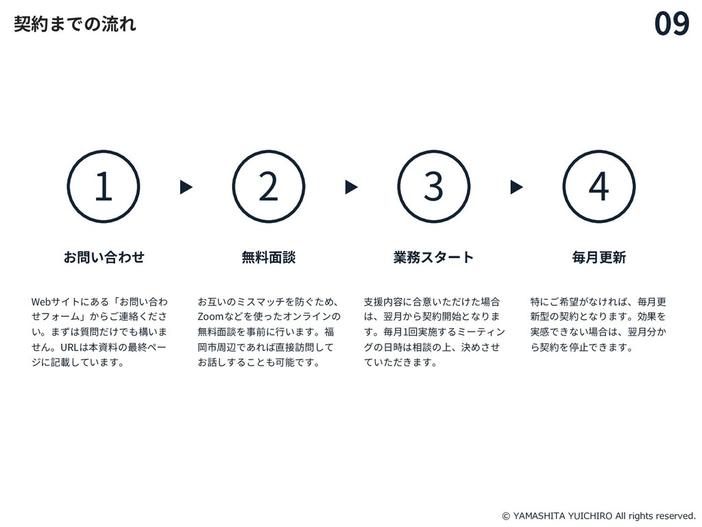 3 4 ▶ ▶ ▶ お問い合わせ 無料⾯談 業務スタート 毎⽉更新 Webサイトにある「お問い合わ せフォーム」からご連絡くださ い。まずは質問だけでも構いま せん。URLは本資料の最終ペー ジに記載しています。 お互いのミスマッチを防ぐため、 Zoomなどを使ったオンラインの 無料⾯談を事前に⾏います。福 岡市周辺であれば直接訪問して お話しすることも可能です。 ⽀援内容に合意いただけた場合 は、翌⽉から契約開始となりま す。毎⽉1回実施するミーティン グの⽇時は相談の上、決めさせ ていただきます。 特にご希望がなければ、毎⽉更 新型の契約となります。効果を 実感できない場合は、翌⽉分か ら契約を停⽌できます。