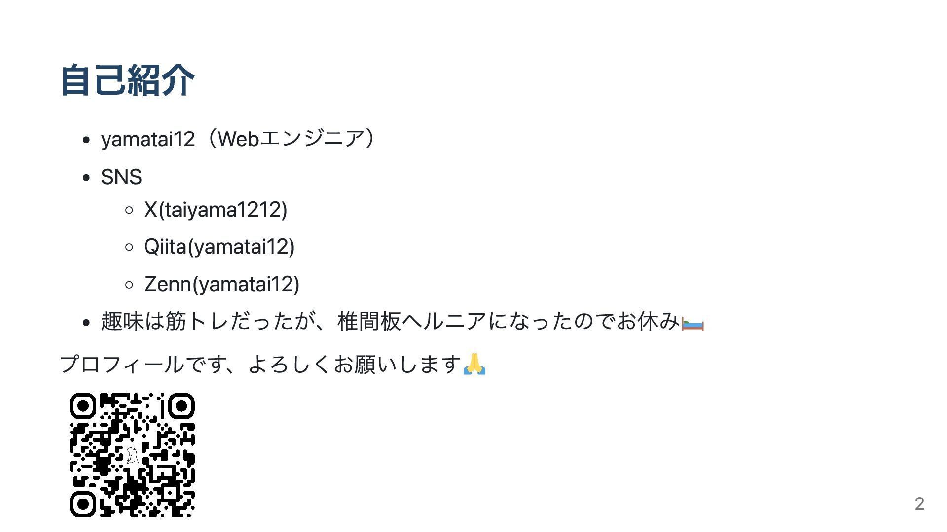 自己紹介 yamatai12(Webエンジニア) SNS X(taiyama1212) Qiita(yamatai12) Zenn(yamatai12) 趣味は筋トレだったが、椎間板ヘルニアになったのでお休み プロフィールです、よろしくお願いします 2