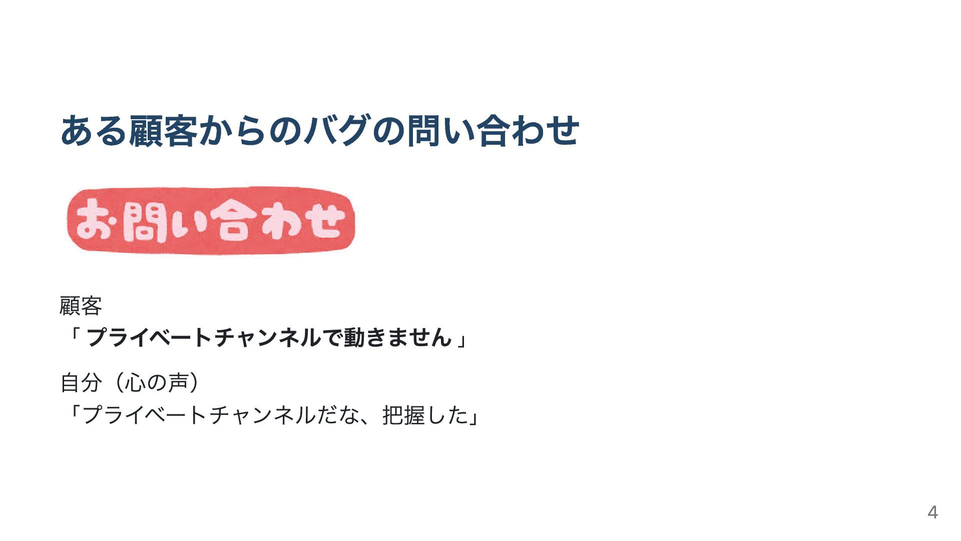 ある顧客からのバグの問い合わせ 顧客 「 プライベートチャンネルで動きません 」 自分(心の声) 「プライベートチャンネルだな、把握した」 4