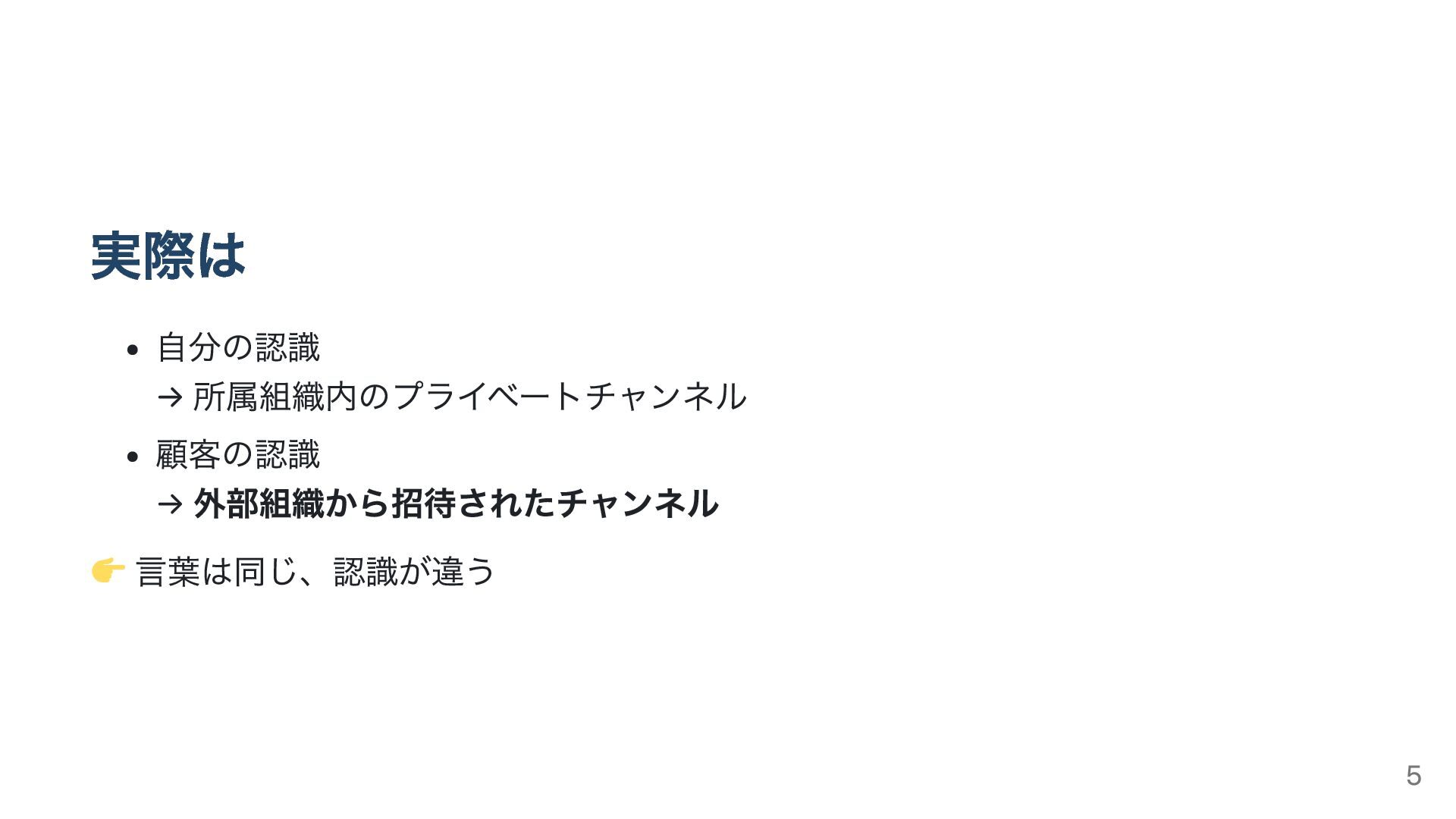 実際は 自分の認識 → 所属組織内のプライベートチャンネル 顧客の認識 → 外部組織から招待されたチャンネル 言葉は同じ、認識が違う 5
