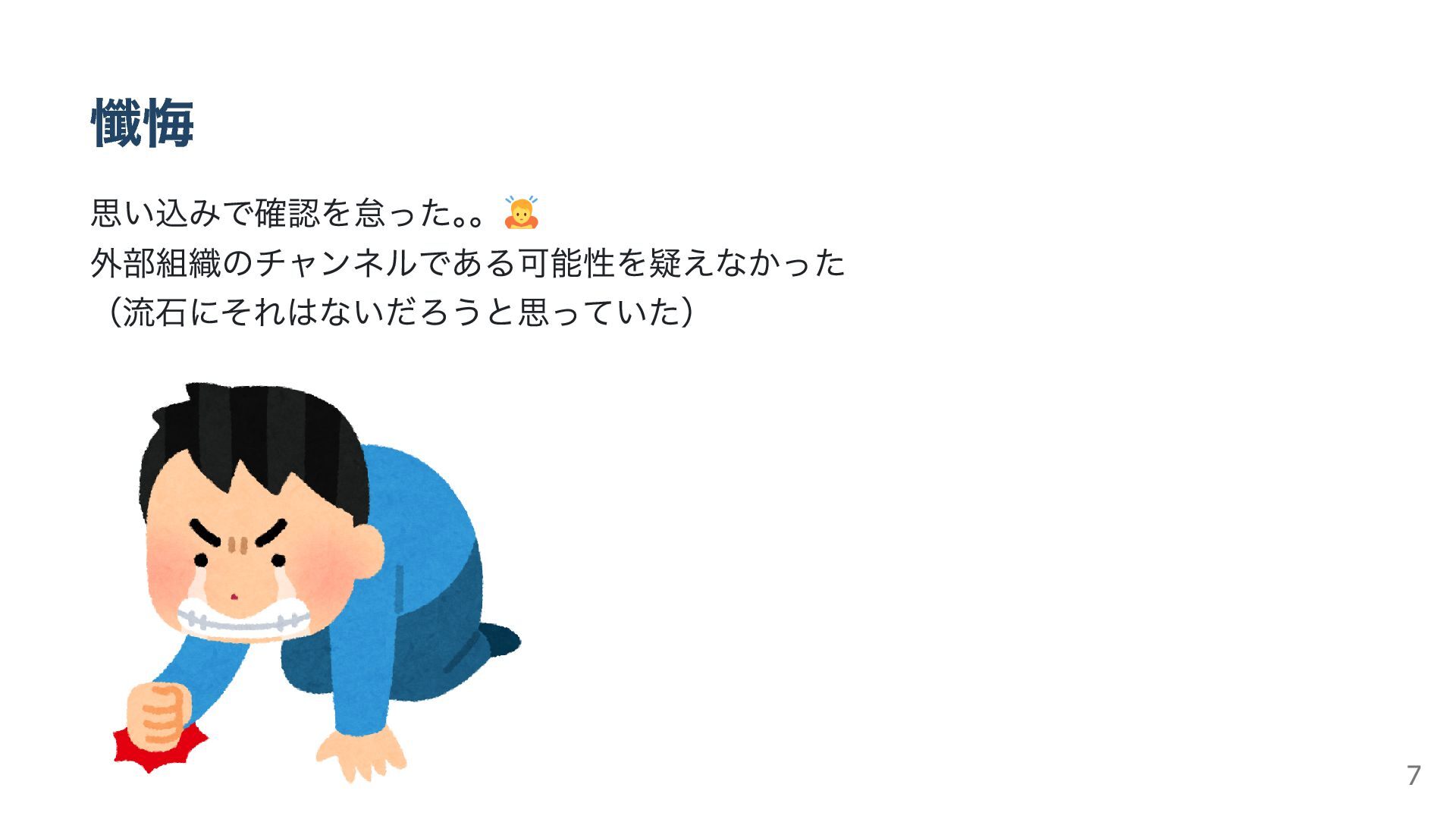 懺悔 思い込みで確認を怠った。 。 外部組織のチャンネルである可能性を疑えなかった (流石にそれはないだろうと思っていた) 7