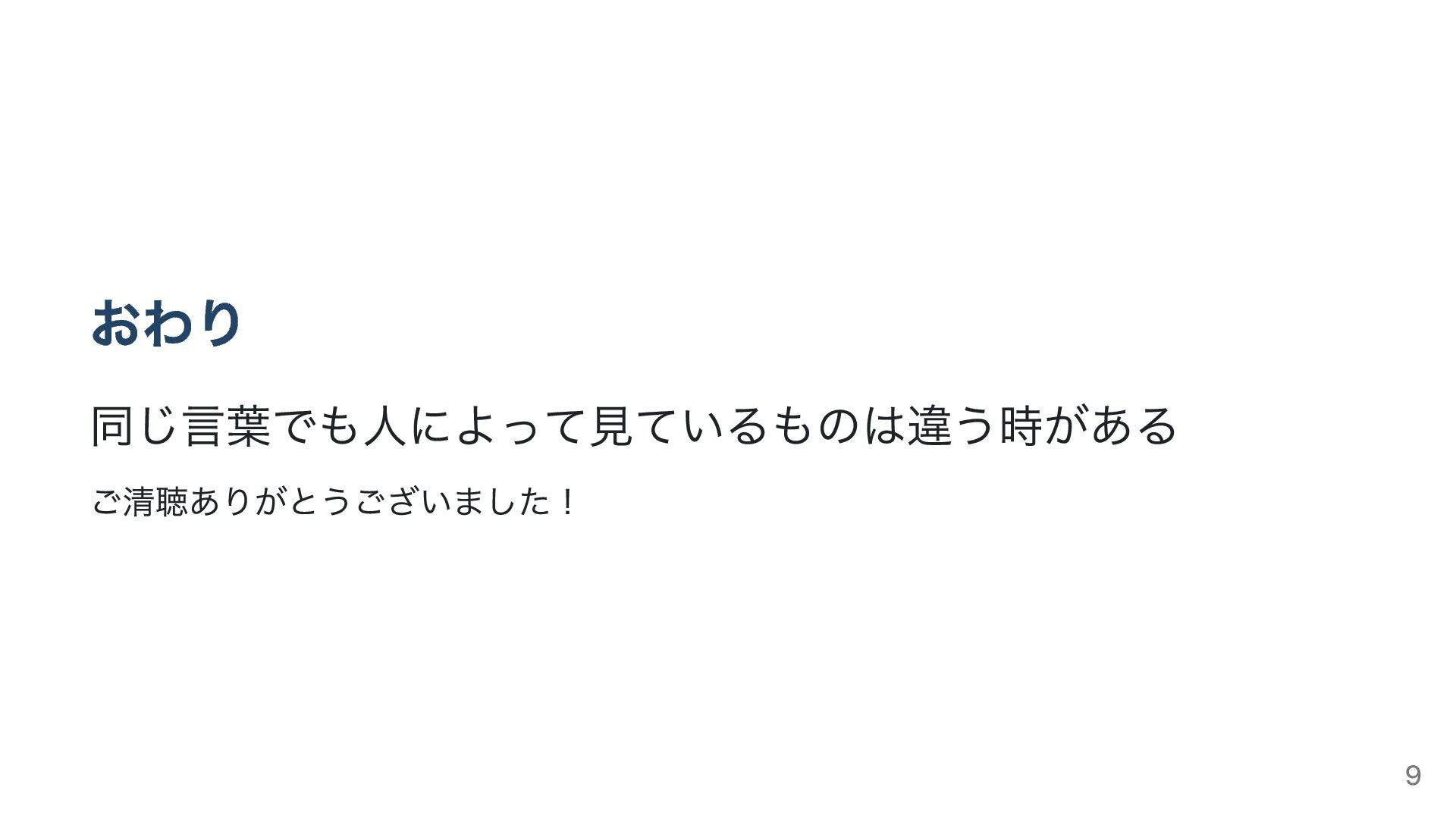 おわり 同じ言葉でも人によって見ているものは違う時がある ご清聴ありがとうございました! 9