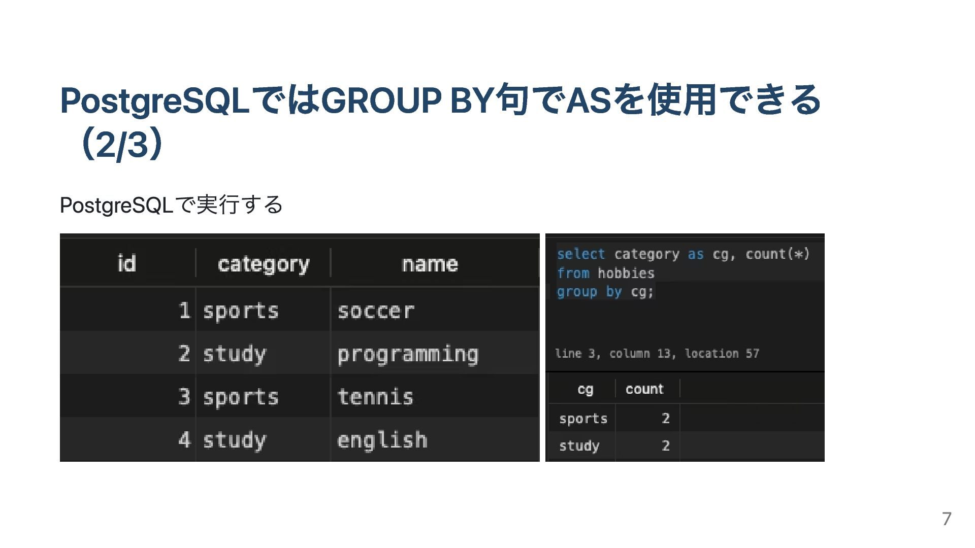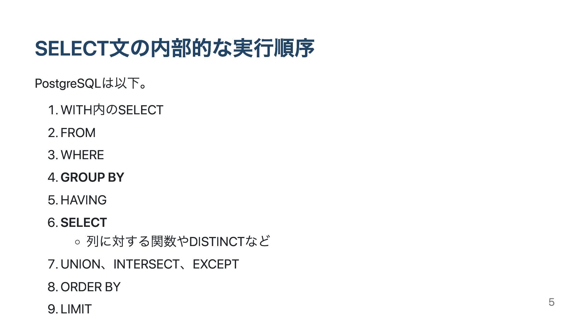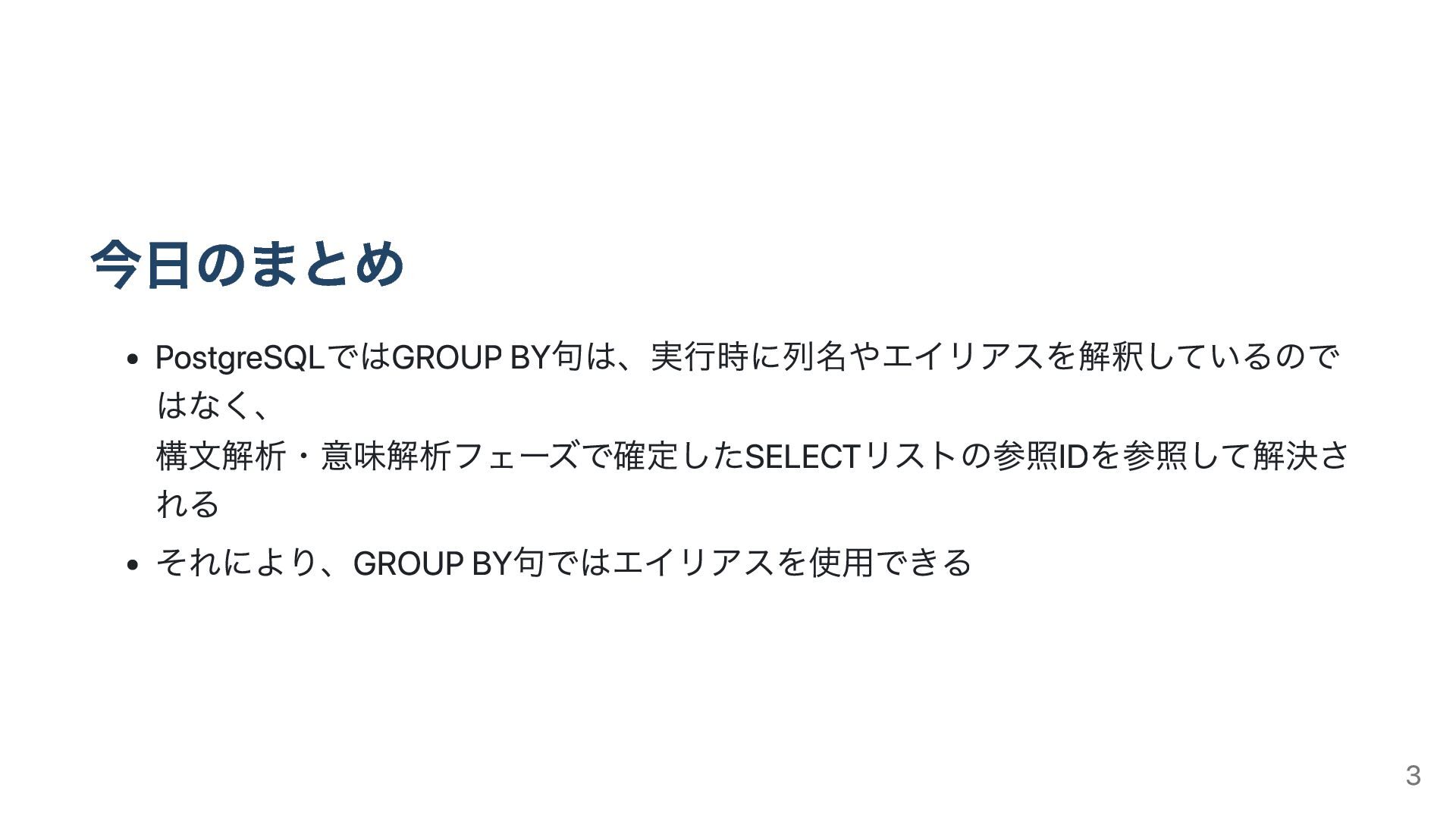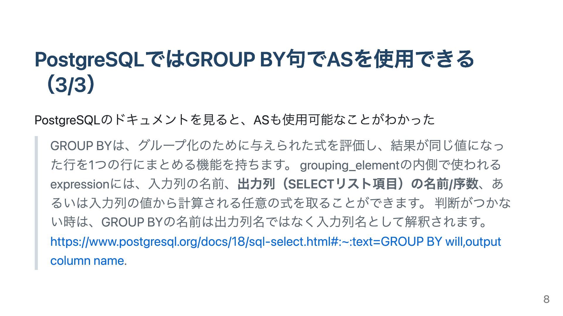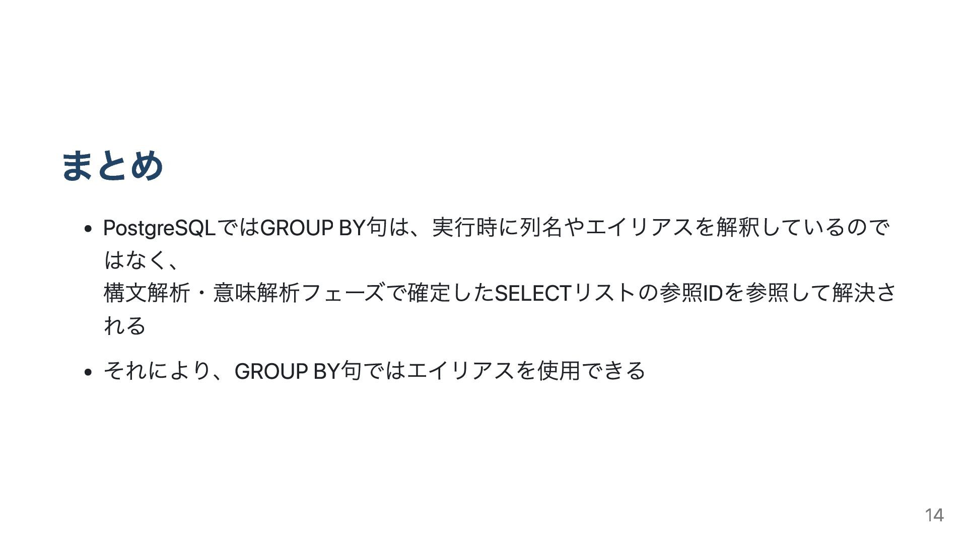 https://qiita.com/yamatai12/items/bc87df974f682c5da4a7 PostgreSQLのGROUP BY句にエイリアスが使える理由について理解する