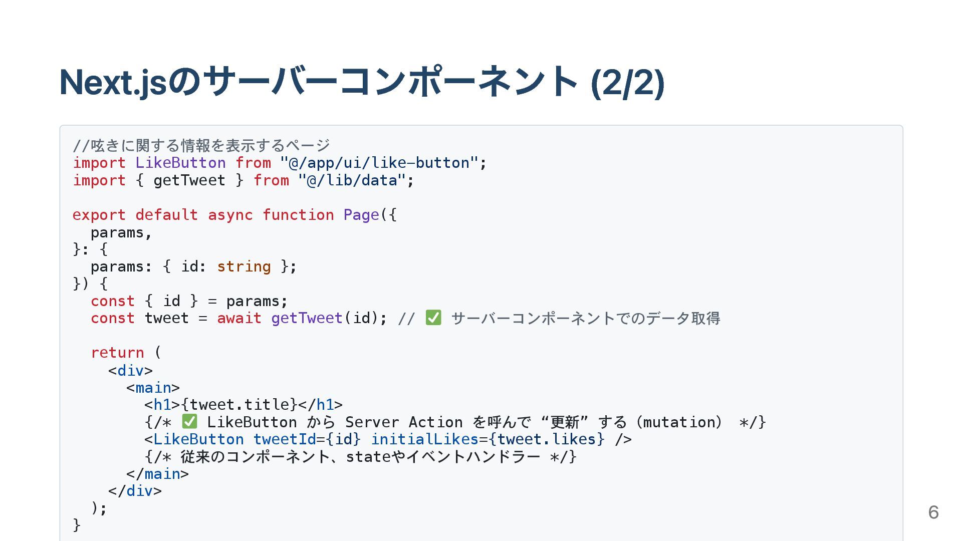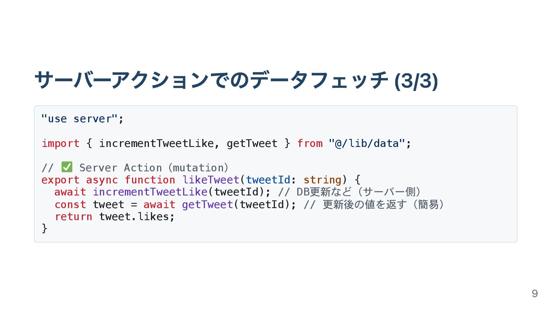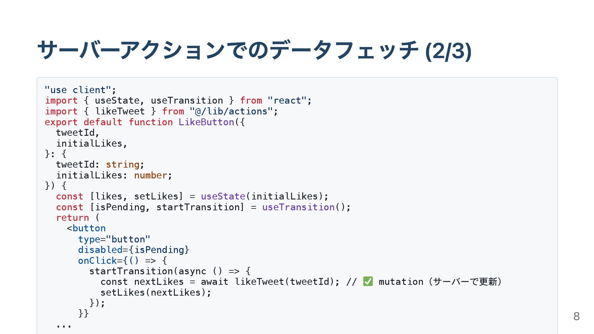 "react"; import { likeTweet } from "@/lib/actions"; export default function LikeButton({ tweetId, initialLikes, }: { tweetId: string; initialLikes: number; }) { const [likes, setLikes] = useState(initialLikes); const [isPending, startTransition] = useTransition(); return ( <button type="button" disabled={isPending} onClick={() => { startTransition(async () => { const nextLikes = await likeTweet(tweetId); // mutation(サーバーで更新) setLikes(nextLikes); }); }} ... 8