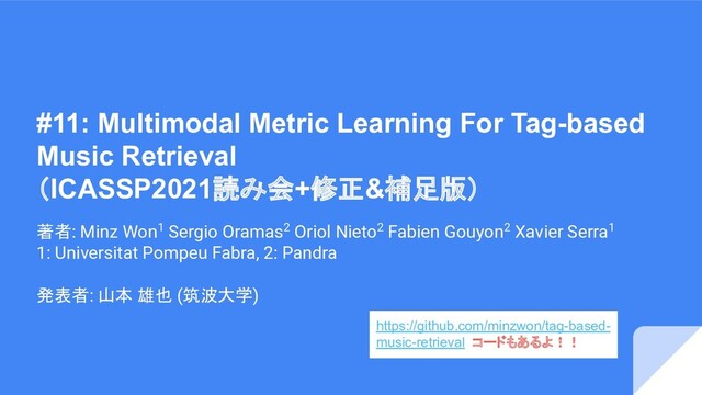 論文:M. Won, S. Oramas, O. Nieto, F. Gouyon and X. Serra, "Multimodal Metric Learning for Tag-Based Music Retrieval," ICASSP 2021 - 2021 IEEE International Conference on Acoustics, Speech and Signal Processing (ICASSP), 2021, pp. 591-595