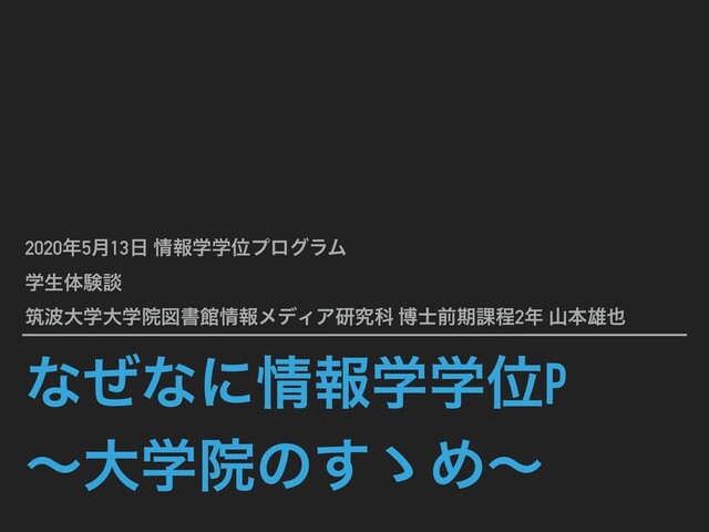 2020.05.13 ஜେֶେֶӃใֶֶҐϓϩάϥϜઆ໌ձ ૯ׅ ▸ ೖࢼʮ͕ࣗใֶֶҐPͰ͔ͩΒͦ͜Ͱ͖ΔݚڀʯΛɹ ໘ʹΘΔΑ͏ʹͦ͏ ▸ ൃද࿅शΛੵ͏ ▸ େֶӃʹߨ͕ٛ͋Γɼ༰ൃలత͔ͭൃද͕ଟ͍