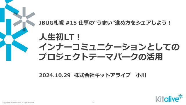 JBUG札幌 #15 仕事の"うまい"進め方をシェアしよう! 人生初LT! インナーコミュニケーションとしての プロジェクトテーマパークの活用 2024.10.29 株式会社キットアライブ 小川 1