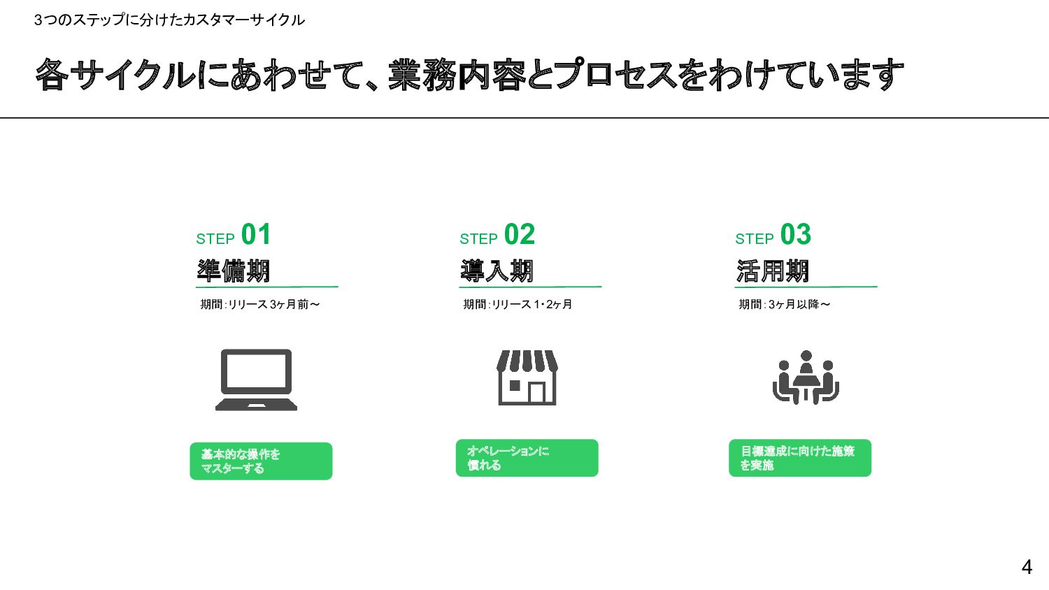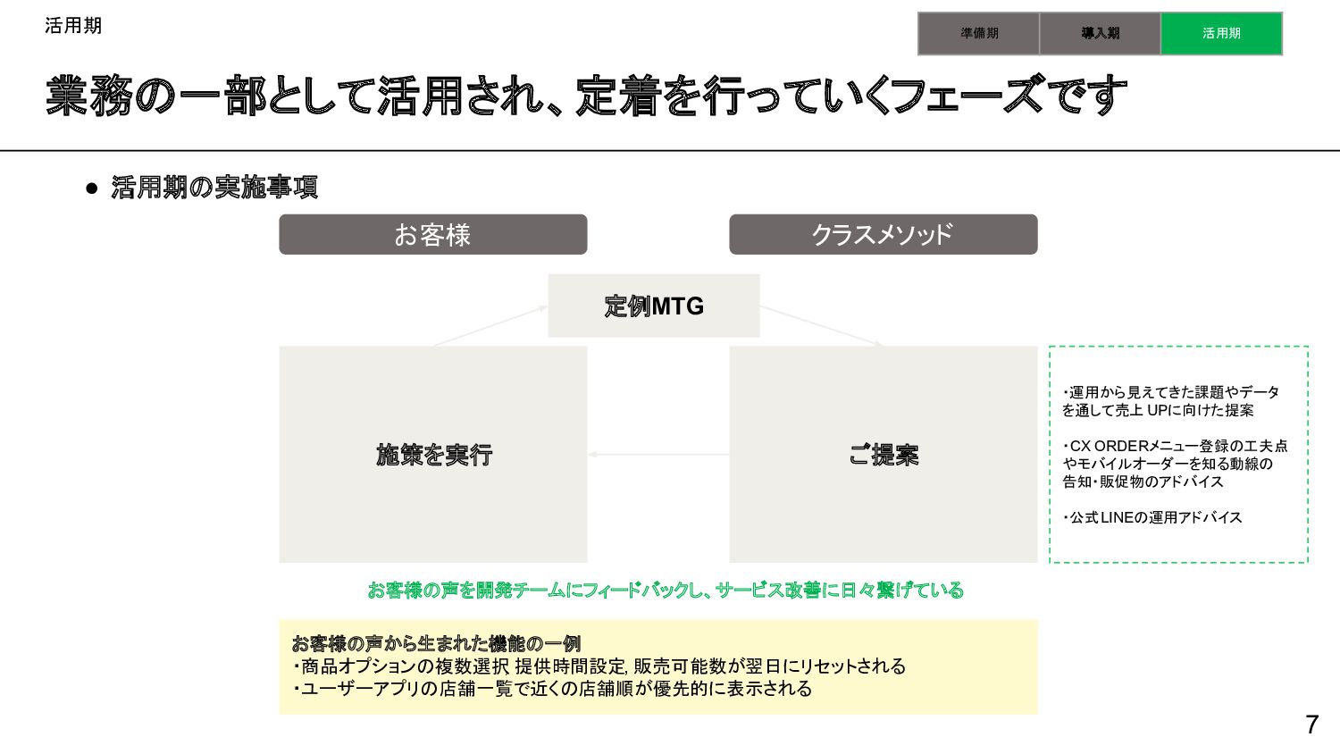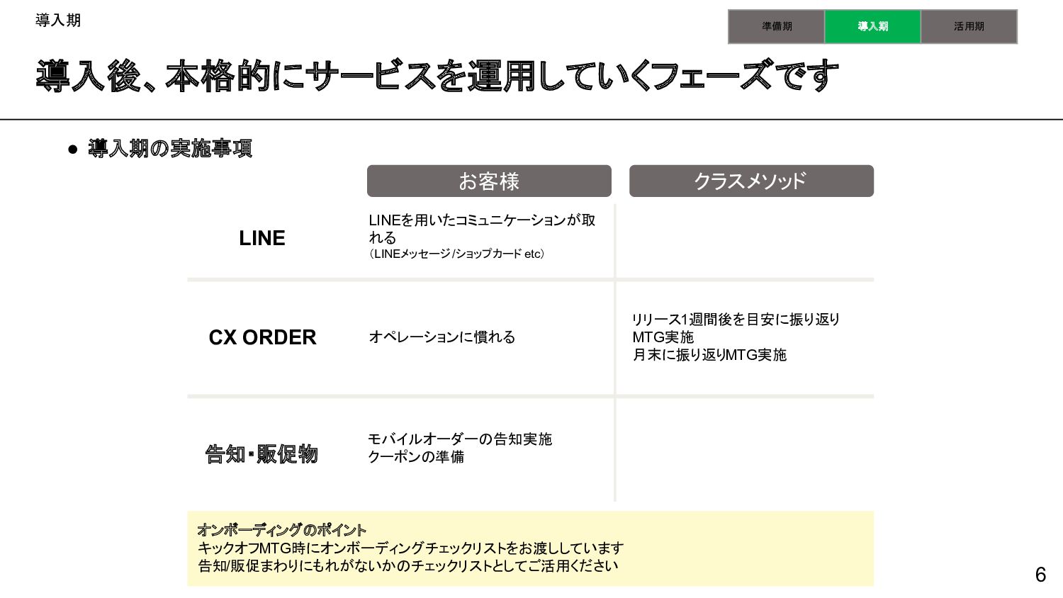 電子決済の準備(GMO) CX ORDER設定 (店舗/商品登録)※画像アリ クーポン設定 オペレーション確認(お声がけ) LINEリッチメニュー LINEメッセージ 各種SNS, Googleビジネスの設定 POP/店頭看板 LINEミニアプリ設定 キックオフMTG 店舗質問会 オペレーション店舗立会い プレスリリース 関連資料 ・よくある質問(https://www.notion.so/cxorder/c51b031724434cd0b7e8e9fcb0d2cd9f) ・マニュアル(https://www.notion.so/cxorder/4860f1efb54b4536a3b97b0e1ca529d2) ・販促物(https://www.notion.so/cxorder/6b1207db235442dcb570e83a700df8b5) 準備期 導入期 活用期 お客様 クラスメソッド • 準備期の実施事項