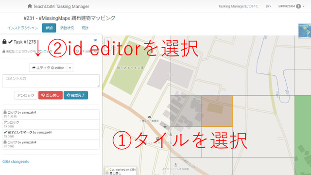 ①タイルを選択 ↓②id editorを選択