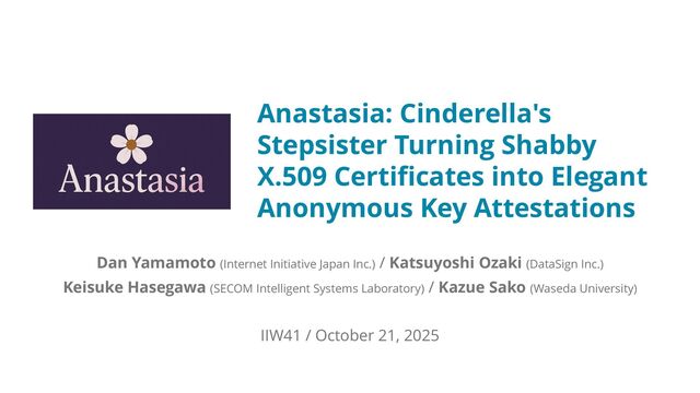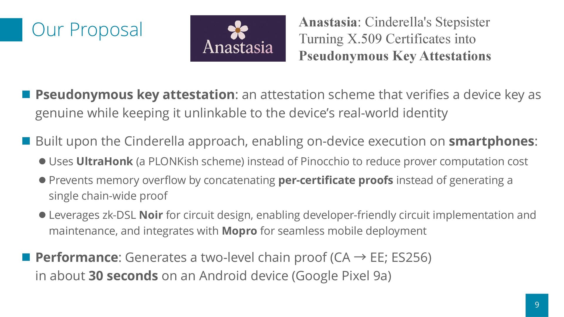 that verifies a device key as genuine while keeping it unlinkable to the device’s real-world identity n Built upon the Cinderella approach, enabling on-device execution on smartphones: l Uses UltraHonk (a PLONKish scheme) instead of Pinocchio to reduce prover computation cost l Prevents memory overflow by concatenating per-certificate proofs instead of generating a single chain-wide proof l Leverages zk-DSL Noir for circuit design, enabling developer-friendly circuit implementation and maintenance, and integrates with Mopro for seamless mobile deployment n Performance: Generates a two-level chain proof (CA → EE; ES256) in about 30 seconds on an Android device (Google Pixel 9a) Anastasia: Cinderella's Stepsister Turning X.509 Certificates into Pseudonymous Key Attestations