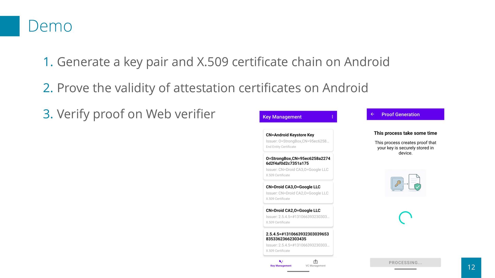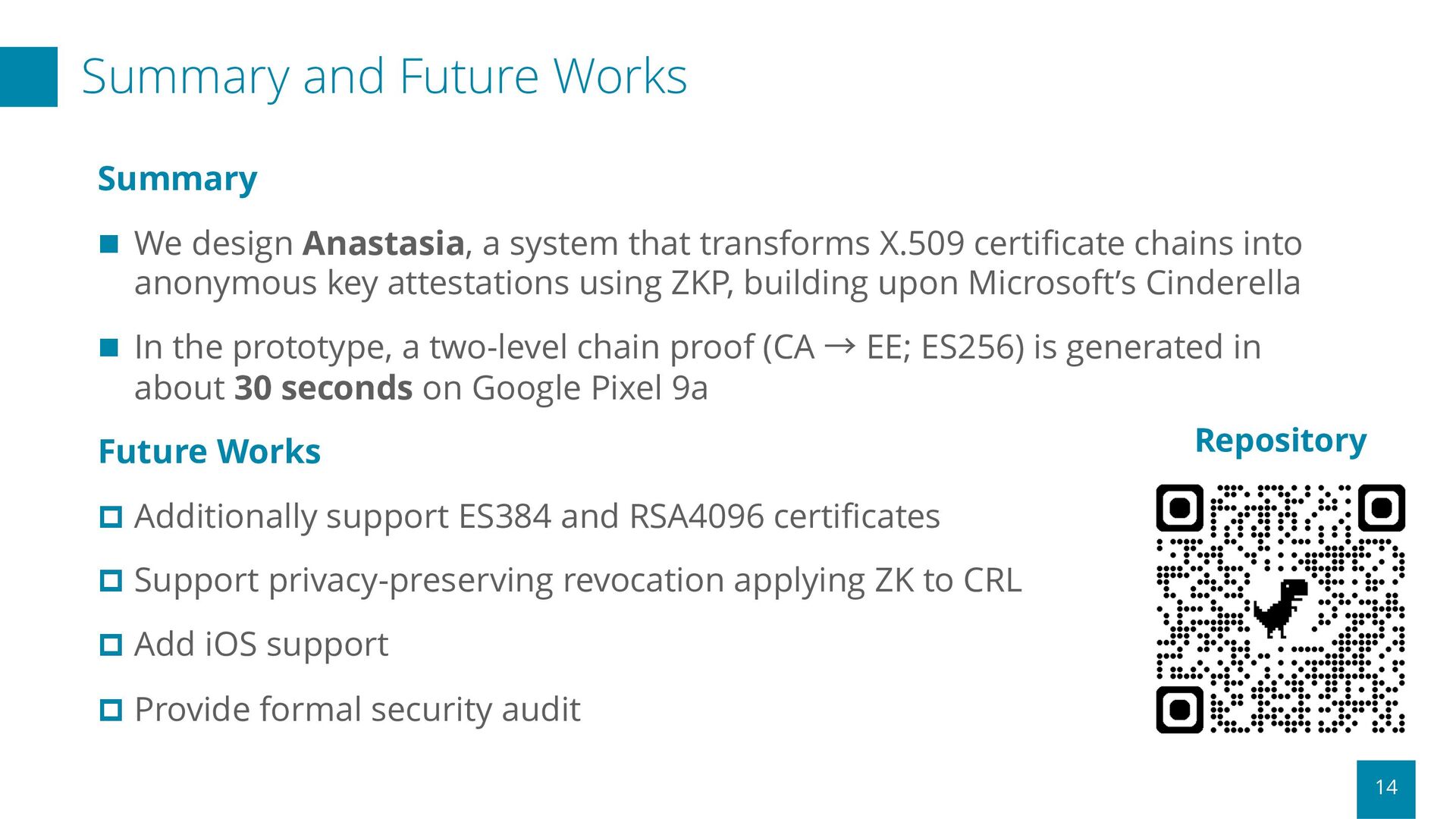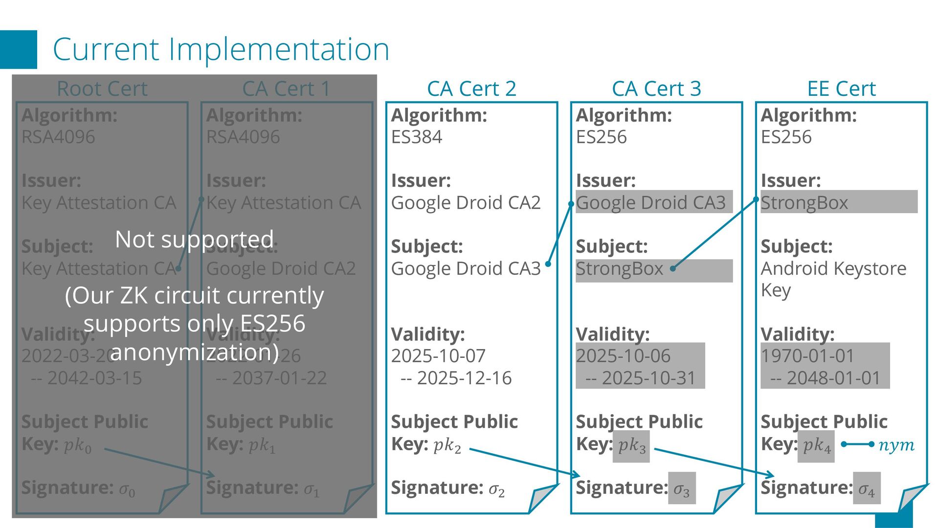 a system that transforms X.509 certificate chains into anonymous key attestations using ZKP, building upon Microsoft’s Cinderella n In the prototype, a two-level chain proof (CA → EE; ES256) is generated in about 30 seconds on Google Pixel 9a Future Works p Additionally support ES384 and RSA4096 certificates p Support privacy-preserving revocation applying ZK to CRL p Add iOS support p Provide formal security audit Repository