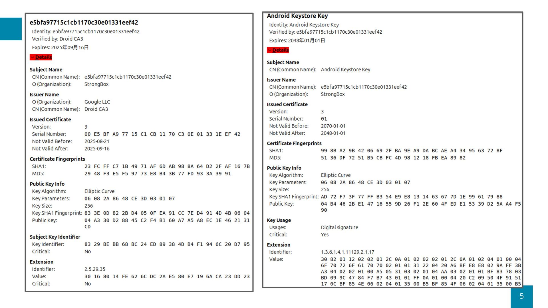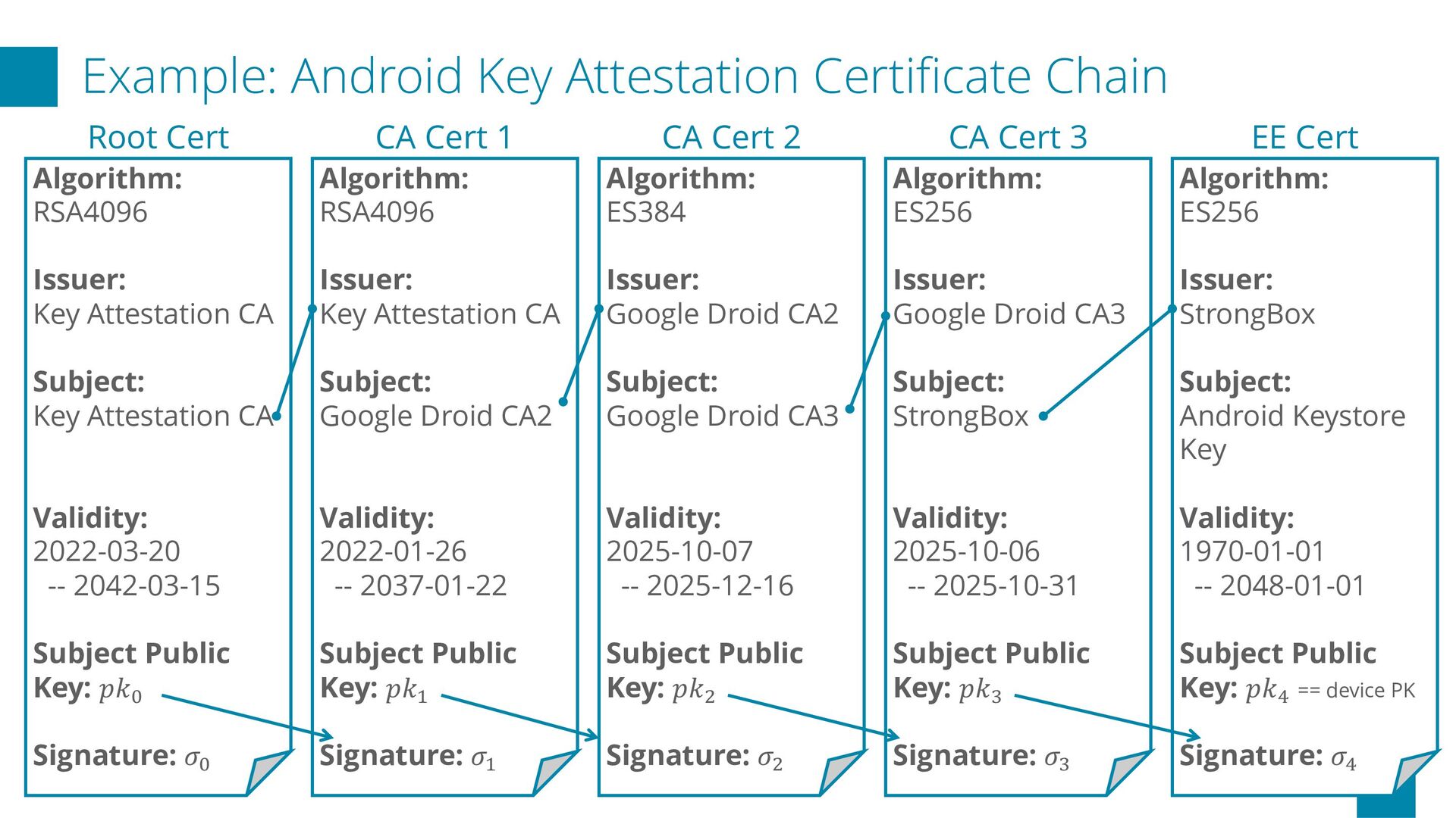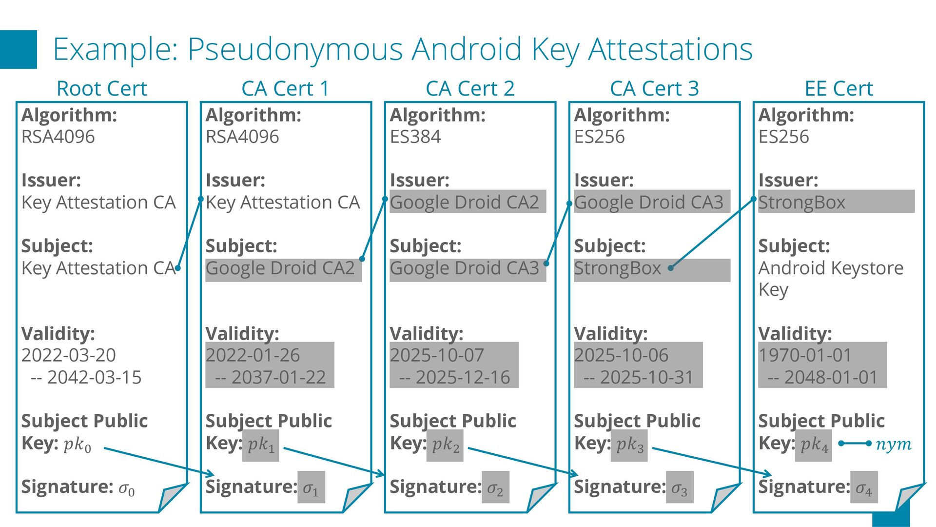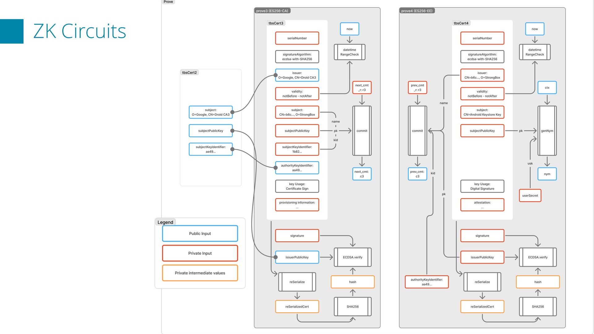 a system that transforms X.509 certificate chains into anonymous key attestations using ZKP, building upon Microsoft’s Cinderella n In the prototype, a two-level chain proof (CA → EE; ES256) is generated in about 30 seconds on Google Pixel 9a Future Works p Additionally support ES384 and RSA4096 certificates p Support privacy-preserving revocation applying ZK to CRL p Add iOS support p Provide formal security audit Repository