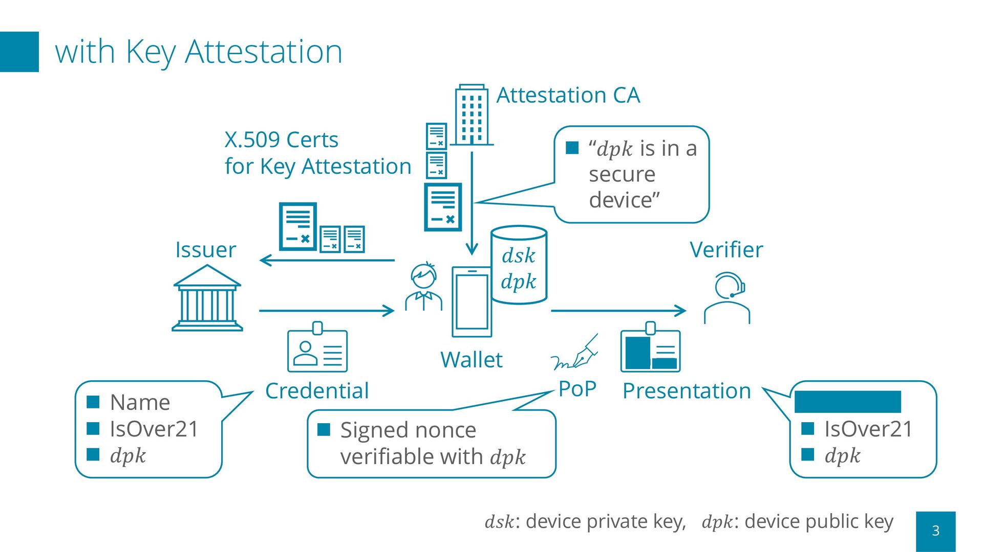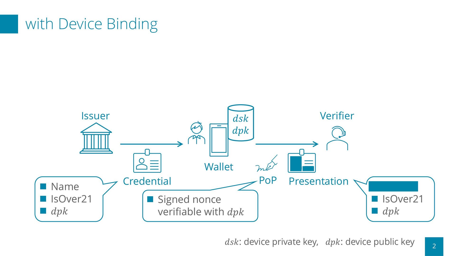 IsOver21 n 𝑑𝑝𝑘 n Signed nonce verifiable with 𝑑𝑝𝑘 𝑑𝑠𝑘 𝑑𝑝𝑘 Credential PoP Presentation n n IsOver21 n 𝑑𝑝𝑘 𝑑𝑠𝑘: device private key, 𝑑𝑝𝑘: device public key