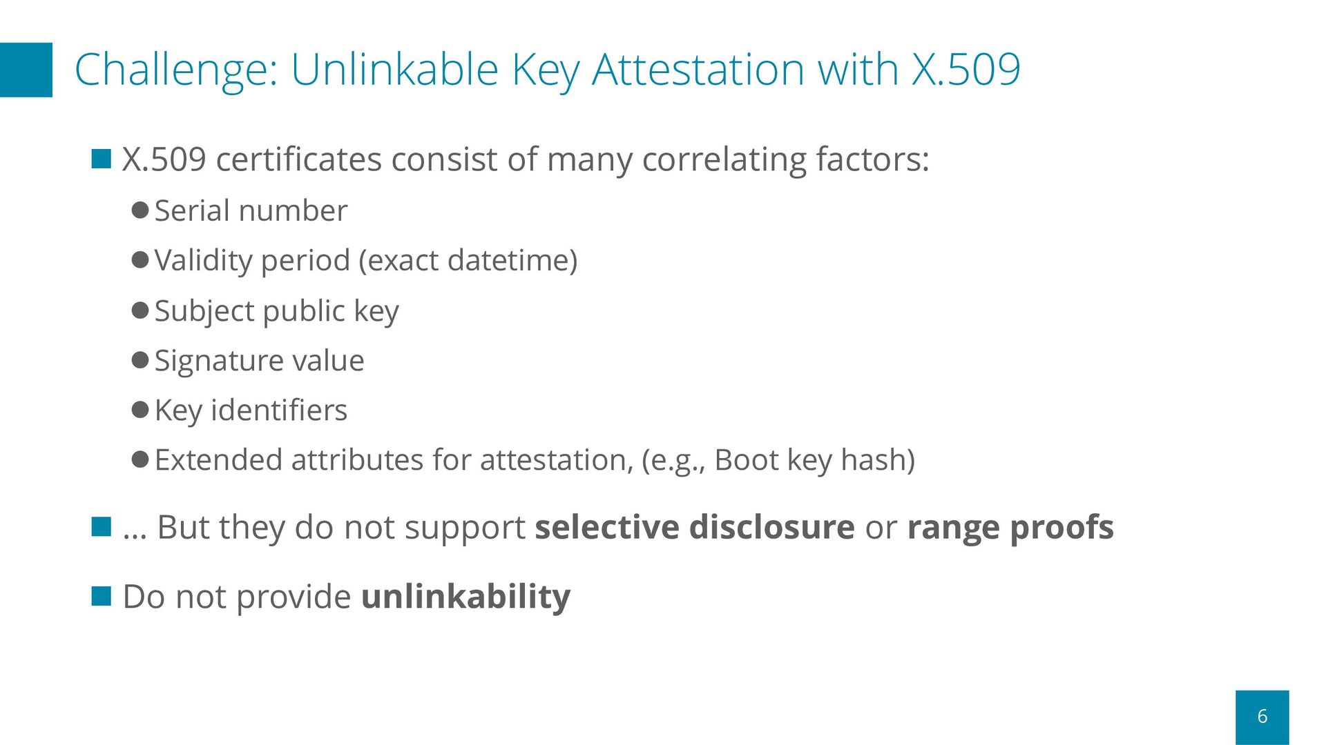 consist of many correlating factors: lSerial number lValidity period (exact datetime) lSubject public key lSignature value lKey identifiers lExtended attributes for attestation, (e.g., Boot key hash) n … But they do not support selective disclosure or range proofs n Do not provide unlinkability