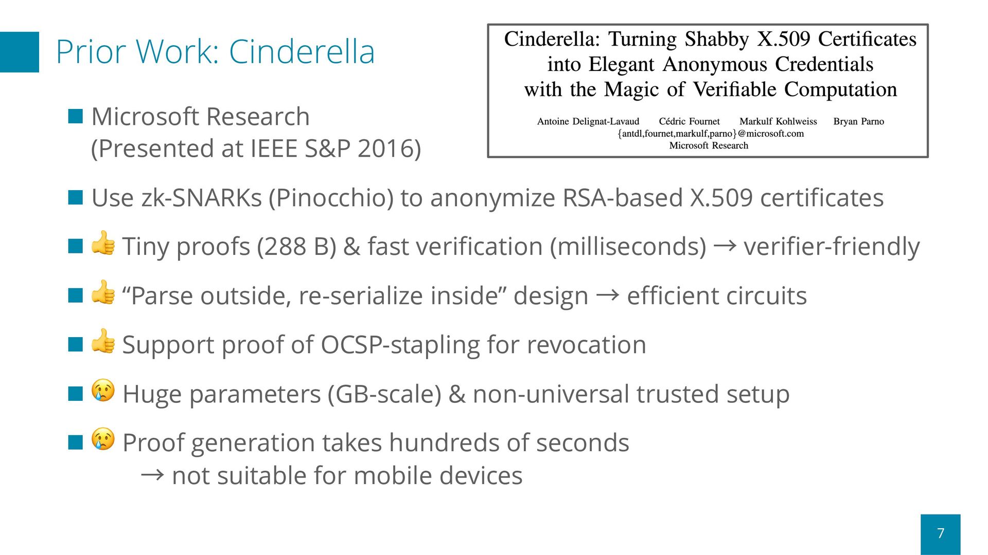 S&P 2016) n Use zk-SNARKs (Pinocchio) to anonymize RSA-based X.509 certificates n 👍 Tiny proofs (288 B) & fast verification (milliseconds) → verifier-friendly n 👍 “Parse outside, re-serialize inside” design → efficient circuits n 👍 Support proof of OCSP-stapling for revocation n 😢 Huge parameters (GB-scale) & non-universal trusted setup n 😢 Proof generation takes hundreds of seconds → not suitable for mobile devices