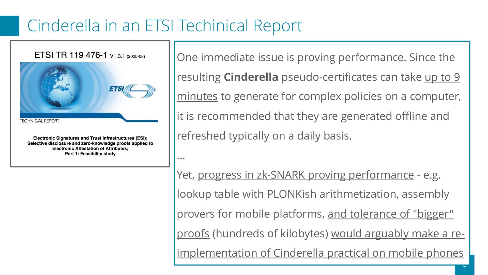 is proving performance. Since the resulting Cinderella pseudo-certificates can take up to 9 minutes to generate for complex policies on a computer, it is recommended that they are generated offline and refreshed typically on a daily basis. … Yet, progress in zk-SNARK proving performance - e.g. lookup table with PLONKish arithmetization, assembly provers for mobile platforms, and tolerance of "bigger" proofs (hundreds of kilobytes) would arguably make a re- implementation of Cinderella practical on mobile phones
