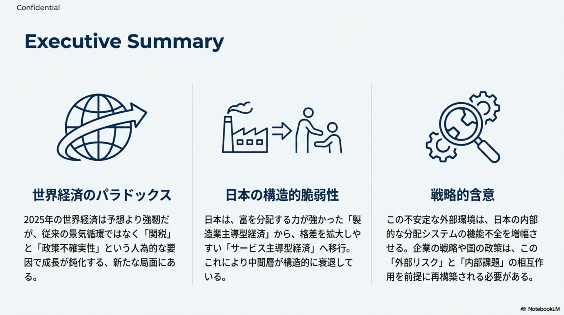 - まずは結論をExecutive Summaryというスライドで端的かつ述べる。
