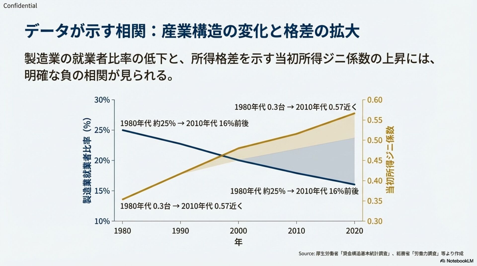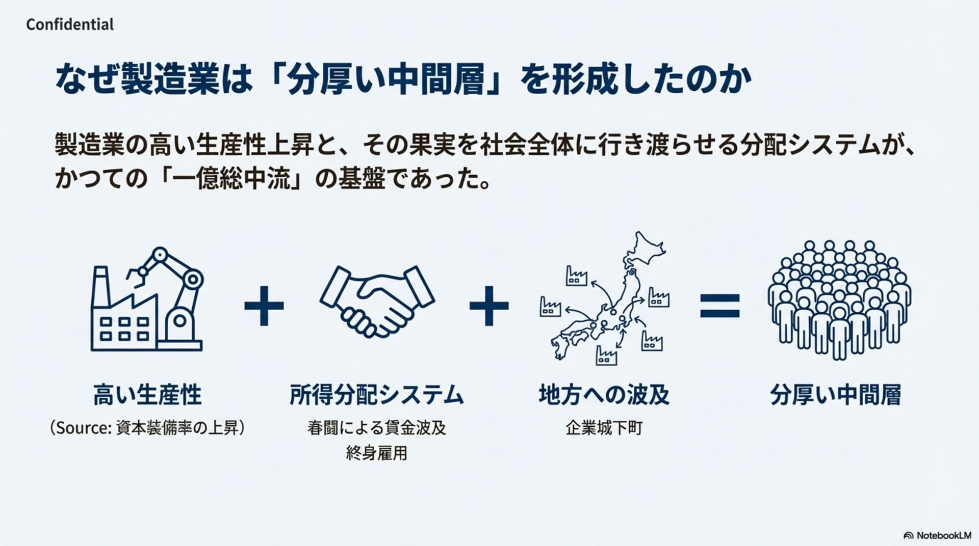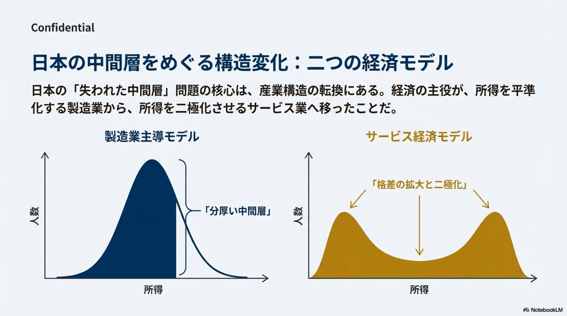 日本において分厚い中間層が形成されたのは、製造業という平均賃金の高い産業が中心産業だったからという説を耳にしました。逆に製造業ではないサービス産業を国の中核産業としてGDP成長した場合、賃金格差が開き社会格差が生まれるという説も合わせて耳にしました。この話についてエビデンスを調査し、検証してもらいたいです。そして事実や私の聞いた定説との差分レポートとしてまとめてください。