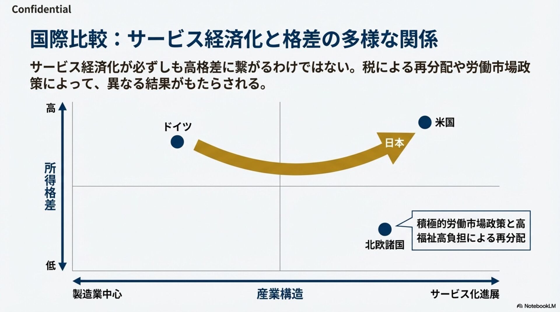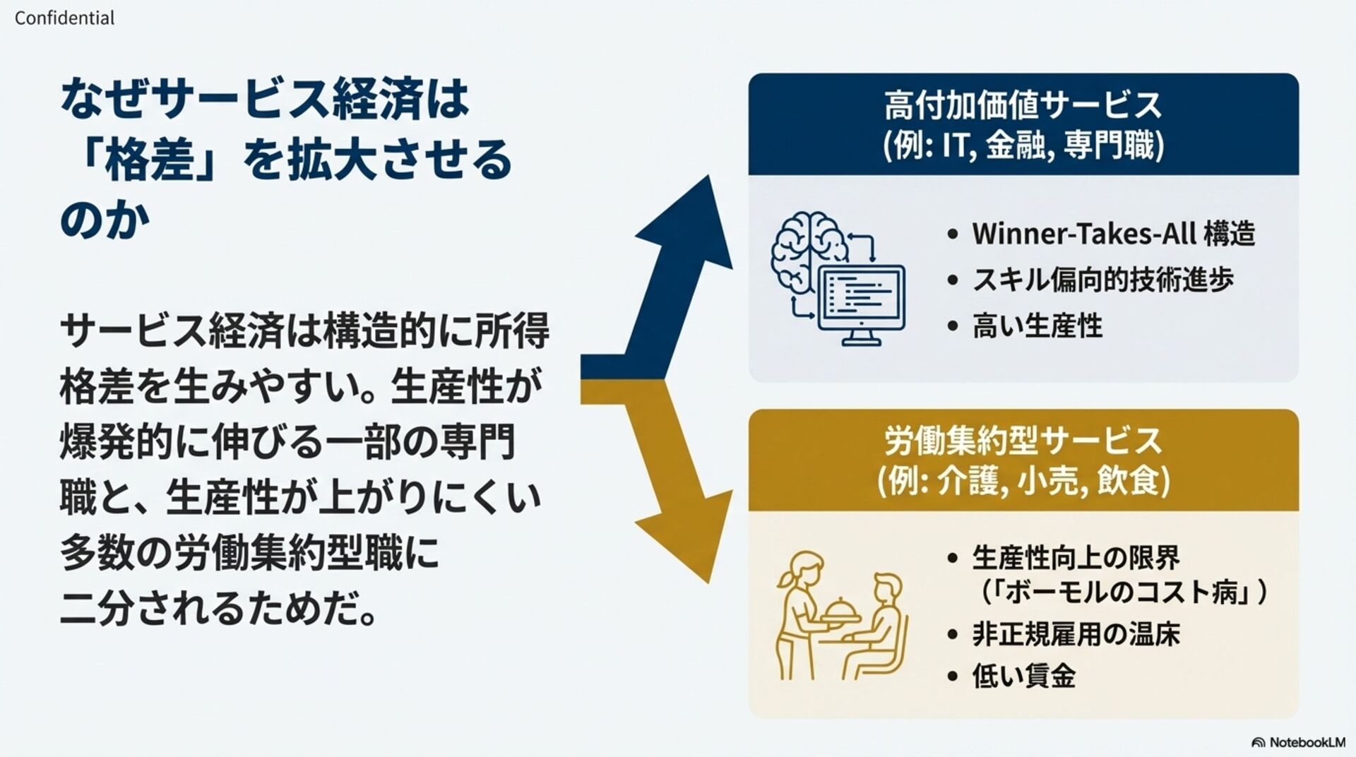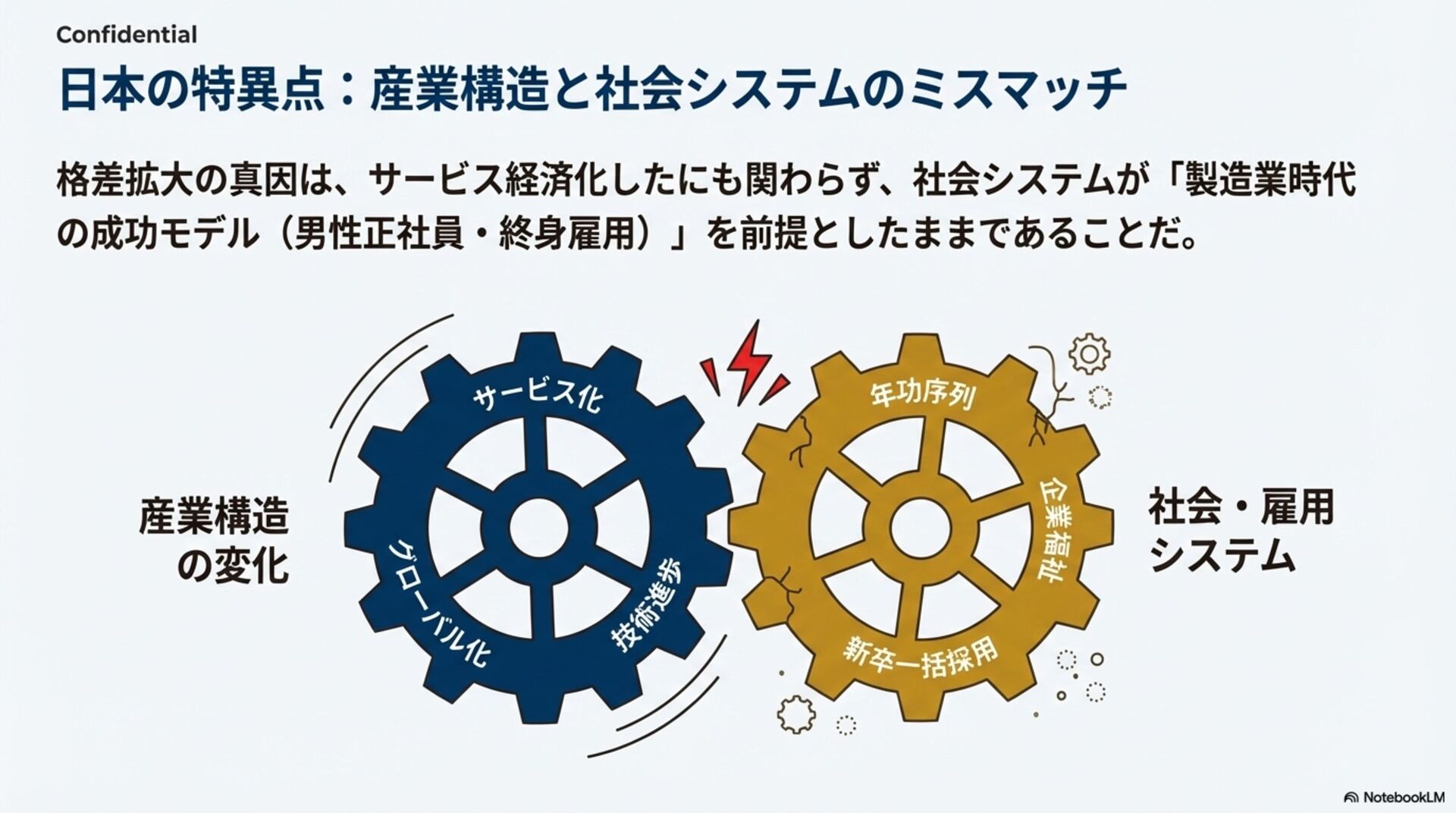 日本において分厚い中間層が形成されたのは、製造業という平均賃金の高い産業が中心産業だったからという説を耳にしました。逆に製造業ではないサービス産業を国の中核産業としてGDP成長した場合、賃金格差が開き社会格差が生まれるという説も合わせて耳にしました。この話についてエビデンスを調査し、検証してもらいたいです。そして事実や私の聞いた定説との差分レポートとしてまとめてください。