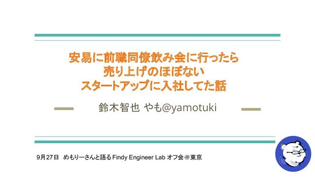 安易に前職同僚飲み会に行ったら 売り上げのほぼない スタートアップに入社してた話 鈴木智也 やも@yamotuki 9月27日 めもりーさんと語る Findy Engineer Lab オフ会@東京