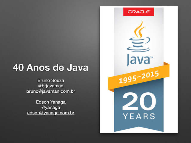 Nessa palestra animada e cheia de referências Brasileiras, vamos recontar os ultimos 20 anos da tecnologia Java sob diferentes pontos de vista. A partir do que a tecnologia Java é hoje, vamos analisar seus impactos na vida do desenvolvedor, e onde a tecnologia Java chegará nos próximos anos. Você, que participou desses útlimos 20 anos, não pode deixar de comparecer a essa comemoração. Venha preparar a sua carreira para os próximos 20 anos!