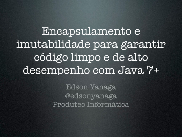 Encapsulamento adequado e imutabilidade de objetos são dois fatores que influenciam em muito a qualidade do código desenvolvido. Nesta palestra demonstraremos como obter estas duas propriedades com diferentes técnicas de construção de objetos. Além disso executaremos alguns testes de desempenho utilizando código sequencial e o Fork/Join Framework do Java 7 nas classes criadas.
