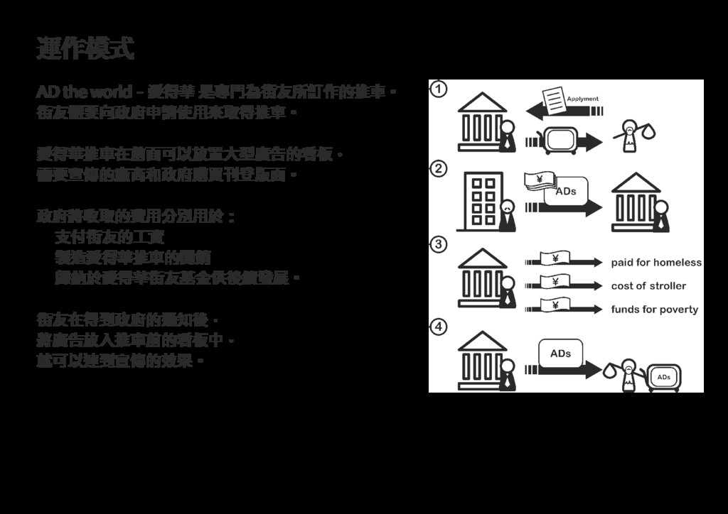 AD the world-愛得華 是專門為街友所訂作的推車。 街友需要向政府申請使用來取得推車。 愛得華推車在前面可以放置大型廣告的看板, 需要宣傳的廠商和政府購買刊登版面。 政府將收取的費用分別用於: 支付街友的工資 製造愛得華推車的開銷