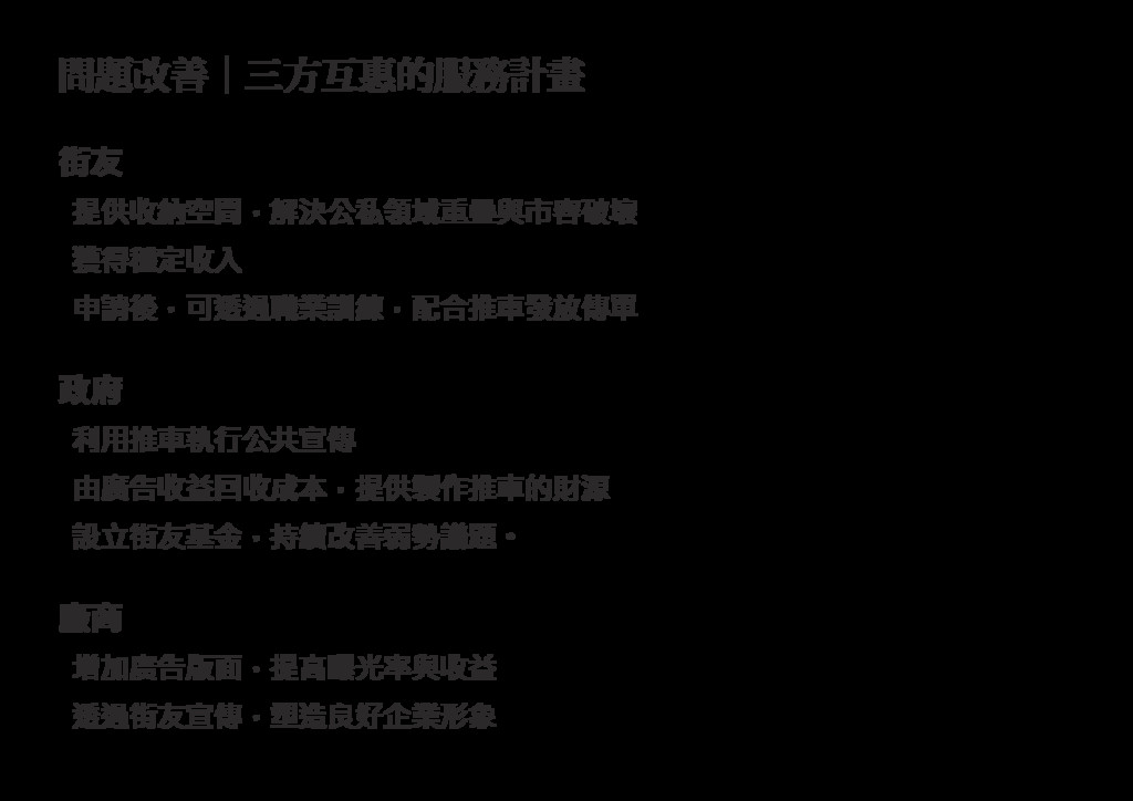 街友 提供收納空間,解決公私領域重疊與市容破壞 獲得穩定收入 申請後,可透過職業訓練,配合推車發放傳單 廠商 增加廣告版面,提高曝光率與收益 透過街友宣傳,塑造良好企業形象 政府 利用推車執行公共宣傳 由廣告收益回收成本,提供製作推車的財源