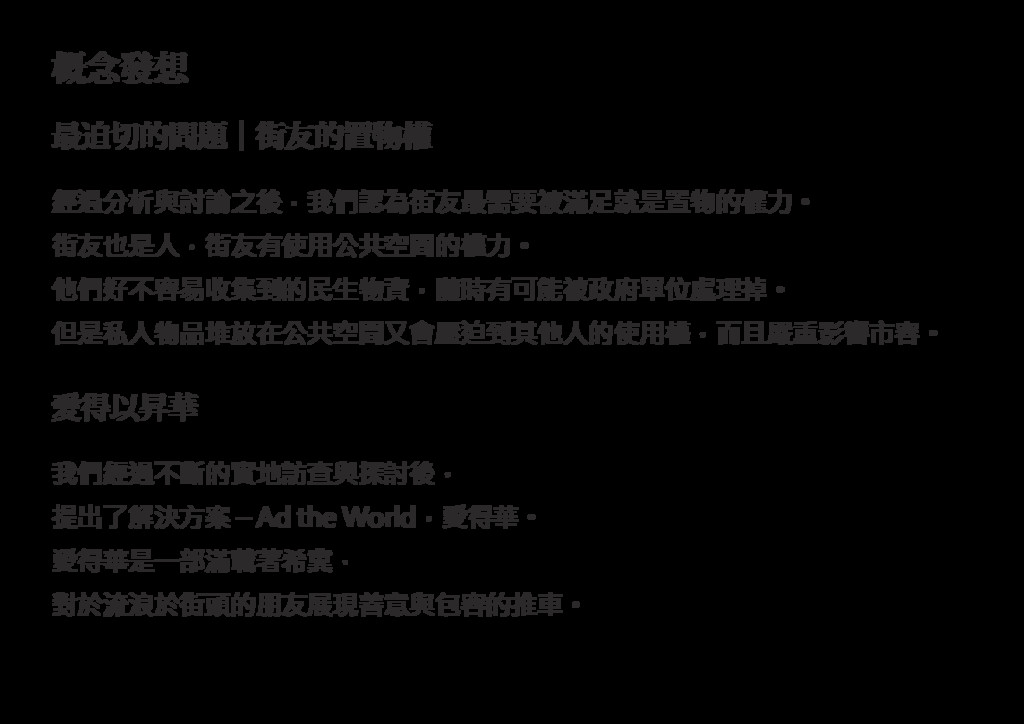 ֓೦ᚙ 經過分析與討論之後,我們認為街友最需要被滿足就是置物的權力。 街友也是人,街友有使用公共空間的權力。 他們好不容易收集到的民生物資,隨時有可能被政府單位處理掉。 但是私人物品堆放在公共空間又會壓迫到其他人的使用權,而且嚴重影響市容。 ࠷ഭతʛ֗༑తஔᒟ 我們經過不斷的實地訪查與探討後, 提出了解決方案 – Ad