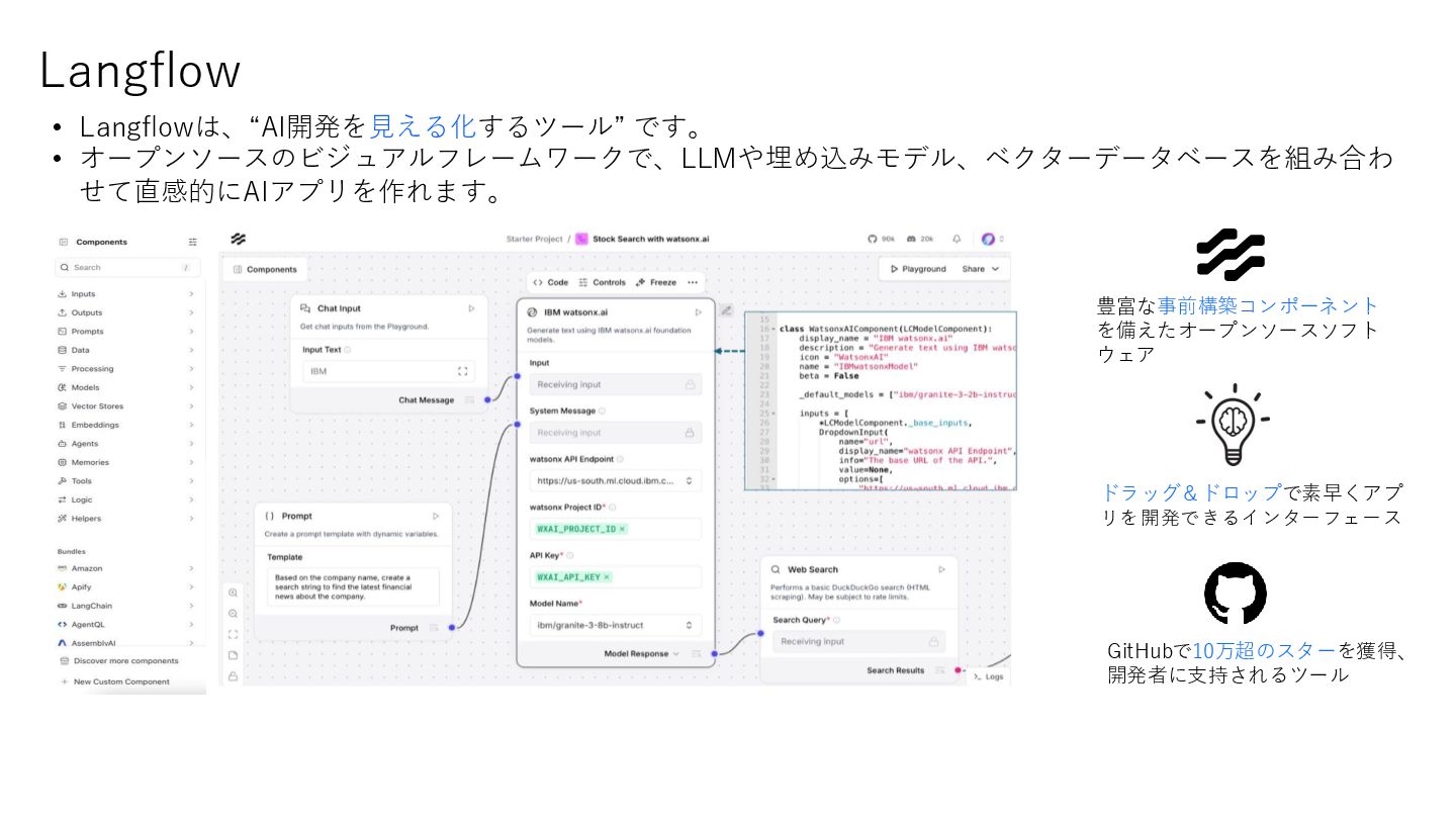 8. • 初心者の方: Langflowをインストールして、本日学んだことを実施してみましょ う! • 技術者の方: Langflowをインストールして、本日学んだことを応用して自分オリジ ナルのAgentを作ってみましょう! • AI
