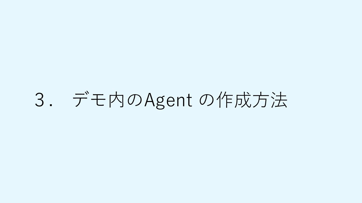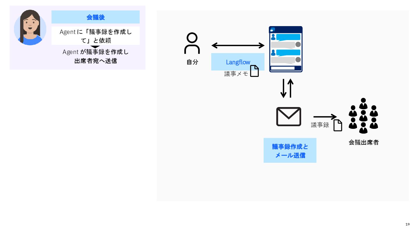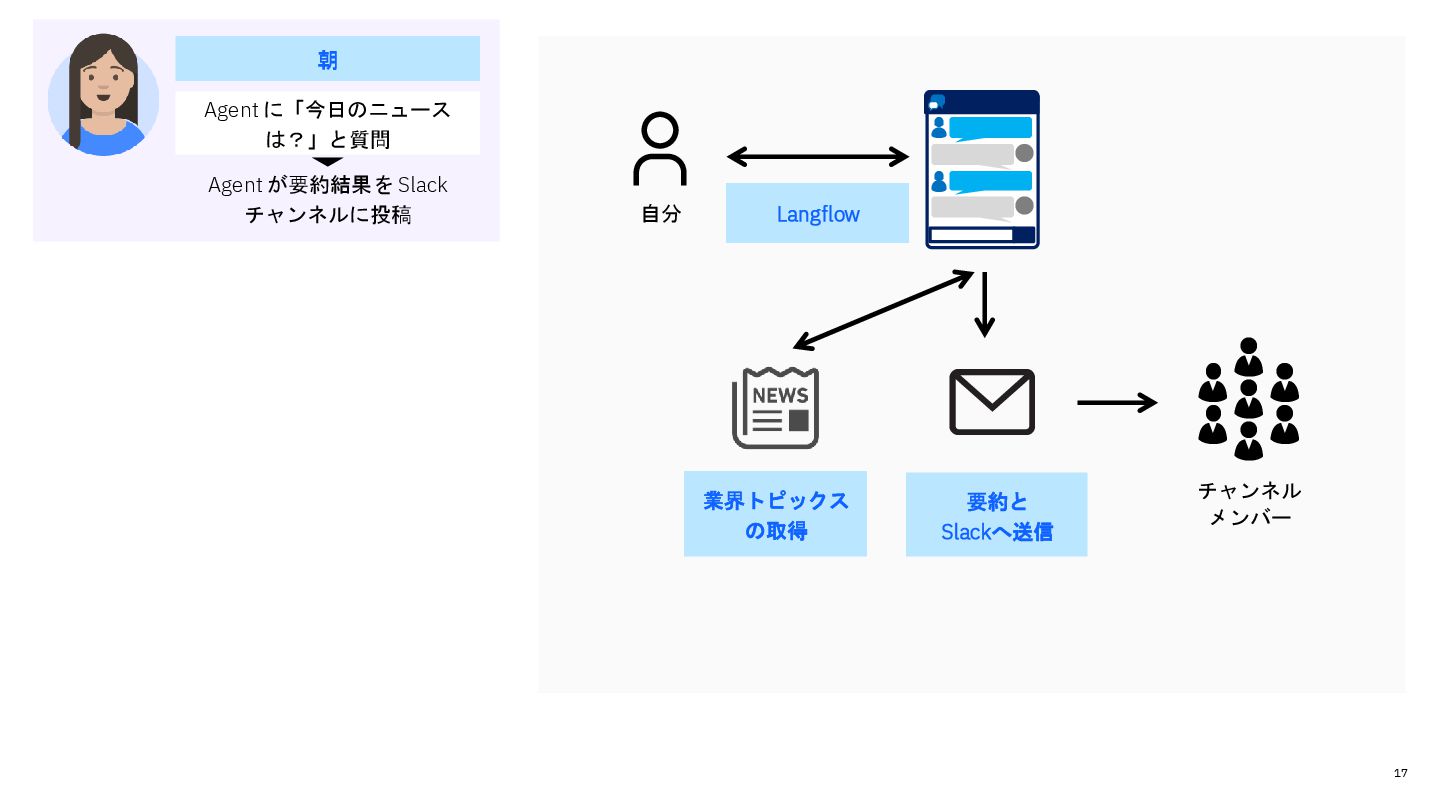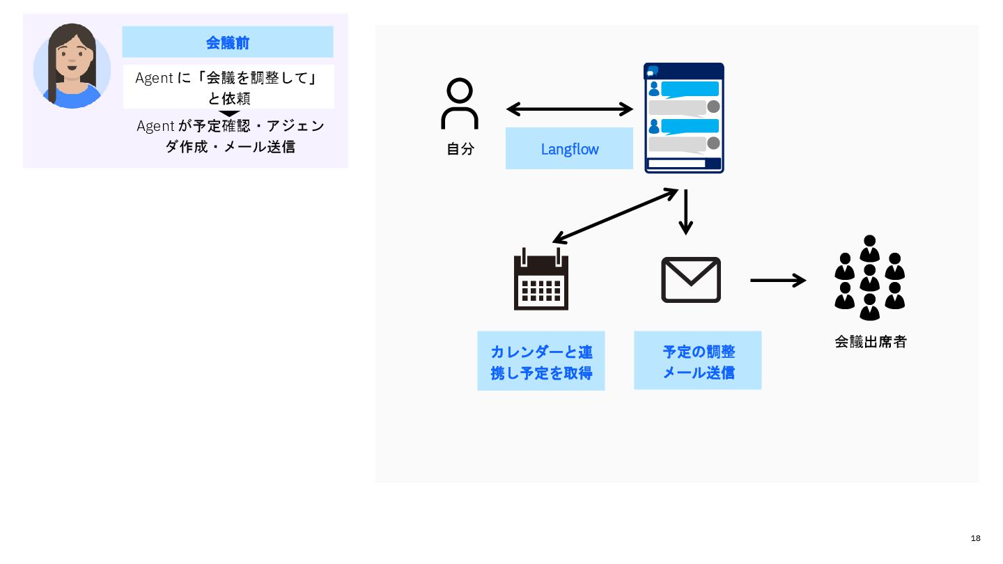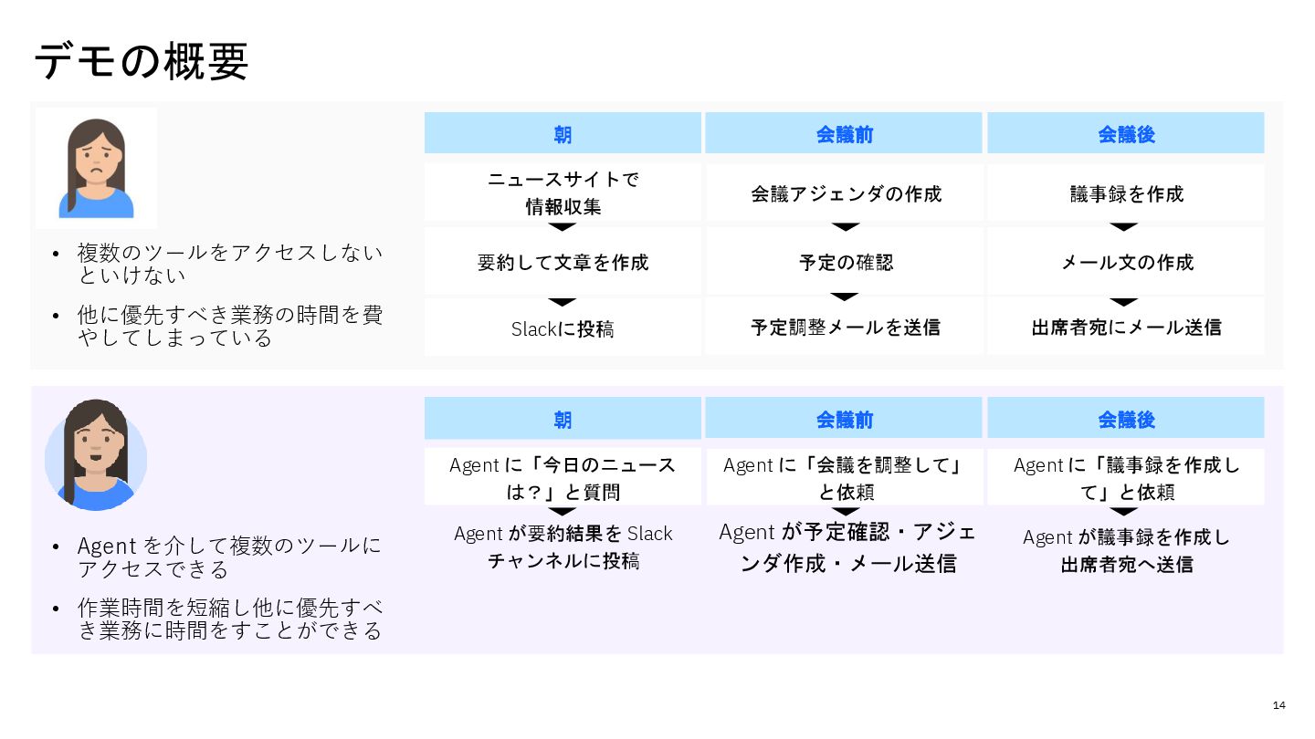 予定の確認 議事録を作成 メール文の作成 出席者宛にメール送信 • 複数のツールをアクセスしない といけない • 他に優先すべき業務の時間を費 やしてしまっている 会議前 朝 会議後 Agent に「今日のニュース は?」と質問 Agent が要約結果を Slack チャンネルに投稿 Agent に「会議を調整して」 と依頼 Agent に「議事録を作成し て」と依頼 Agent が議事録を作成し 出席者宛へ送信 Agent が予定確認・アジェ ンダ作成・メール送信 • Agent を介して複数のツールに アクセスできる • 作業時間を短縮し他に優先すべ き業務に時間をすことができる 予定調整メールを送信