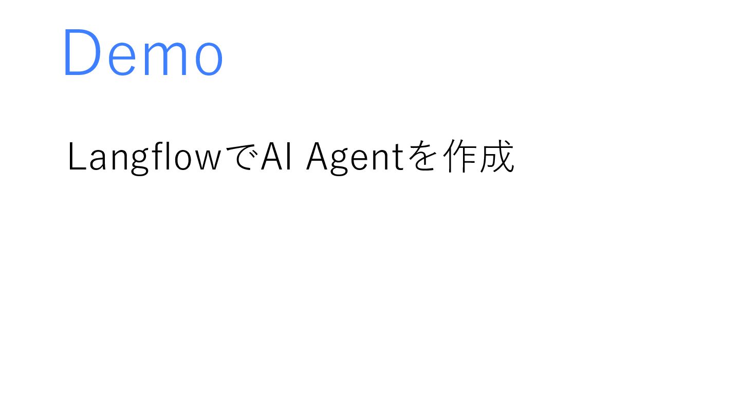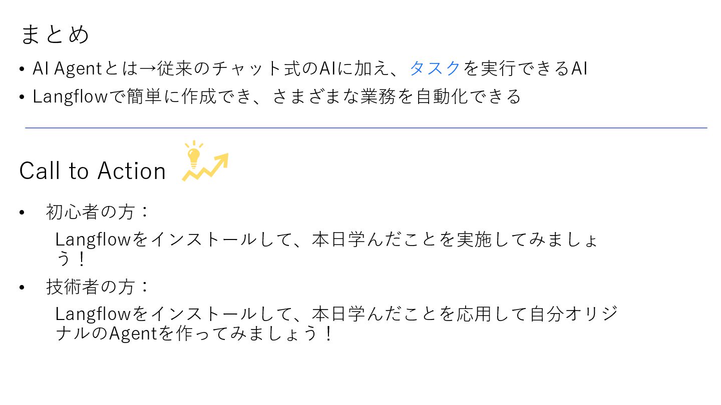 Agentとは→従来のチャット式のAIに加え、タスクを実行できるAI • Langflowで簡単に作成でき、さまざまな業務を自動化できる まとめ Call to Action