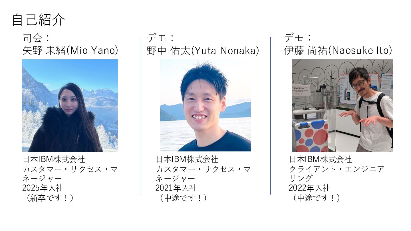 日本IBM株式会社 クライアント・エンジニア リング 2022年入社 (中途です!) デモ: 伊藤 尚祐(Naosuke Ito) デモ: 野中 佑太(Yuta Nonaka) 日本IBM株式会社 カスタマー・サクセス・マ ネージャー 2021年入社 (中途です!)