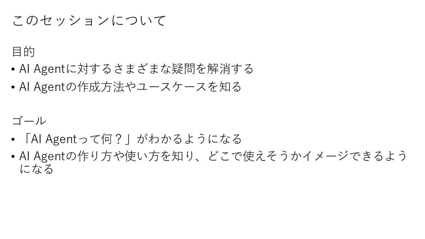 Agentって何?」がわかるようになる • AI Agentの作り方や使い方を知り、どこで使えそうかイメージできるよう になる このセッションについて