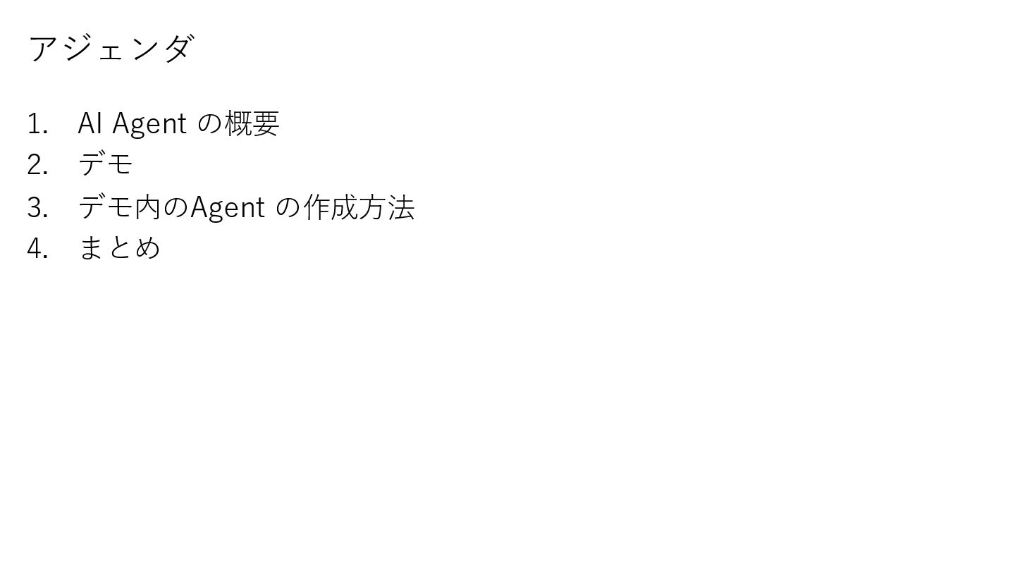 3. 目的 • AI Agentに対するさまざまな疑問を解消する • AI Agentの作成方法やユースケースを知る ゴール • 「AI